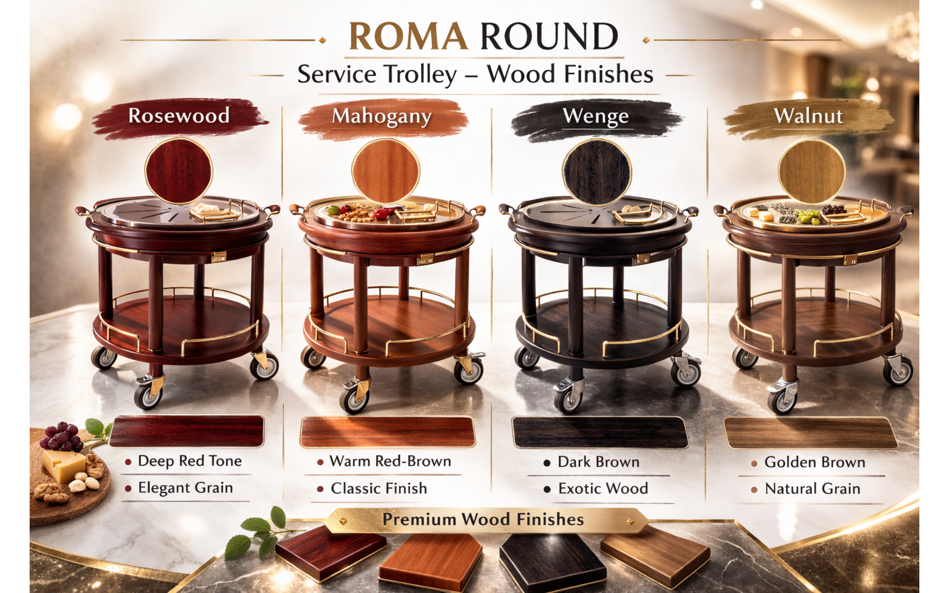 Le chariot de service ROMA à base ronde est fabriqué en bois massif et associe robustesse et élégance. Il dispose d’un plateau de service extractible et de quatre roues, dont deux avec frein, pour un déplacement fluide et sécurisé.