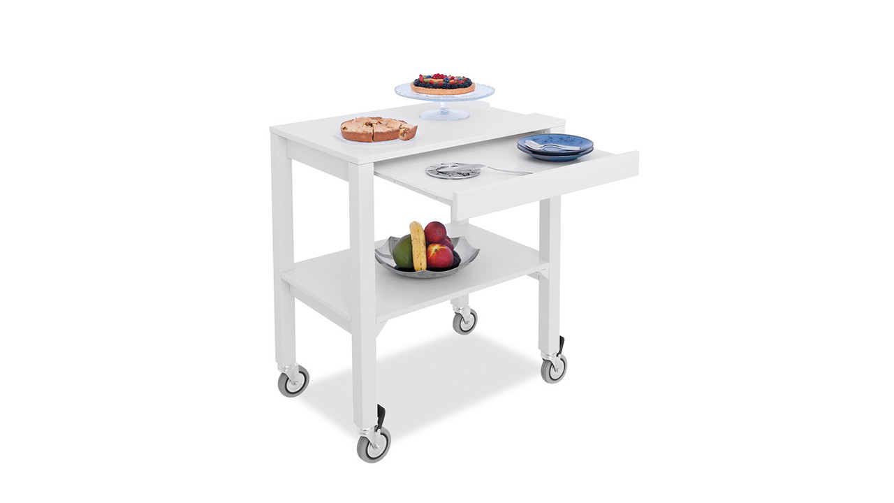 Chariot laqué crème, 2 étagères 70x45 cm, support assiette. Pieds carrés en bois massif, 2 étagères en MDF 70x45 cm, laqué mat couleur crème, poignée de poussée intégrée dans le plateau, porte-assiette amovible.
