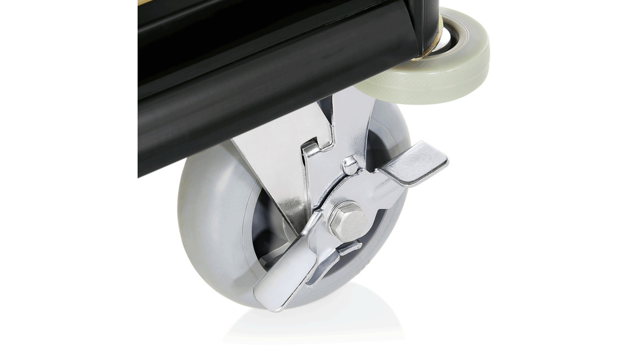 2 roues pivotantes Ø 15 cm, avec frein et 2 roulettes fixes.