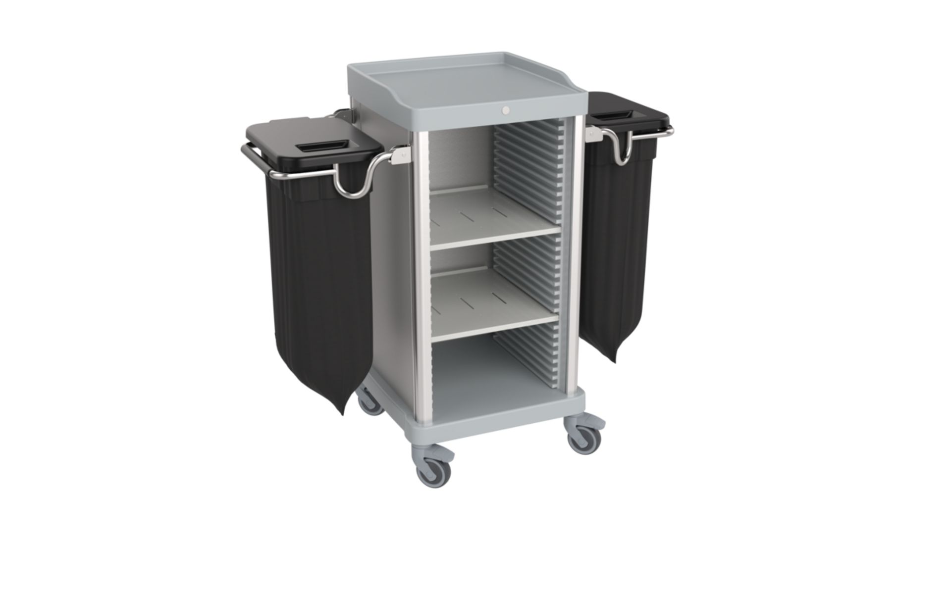 Comprend deux porte-sacs pliables avec couvercles noirs et deux sacs à linge noirs – idéal pour les environnements exigeant efficacité et flexibilité. Également disponible en noir et avec des roulettes en caoutchouc souple pour les surfaces délicates.