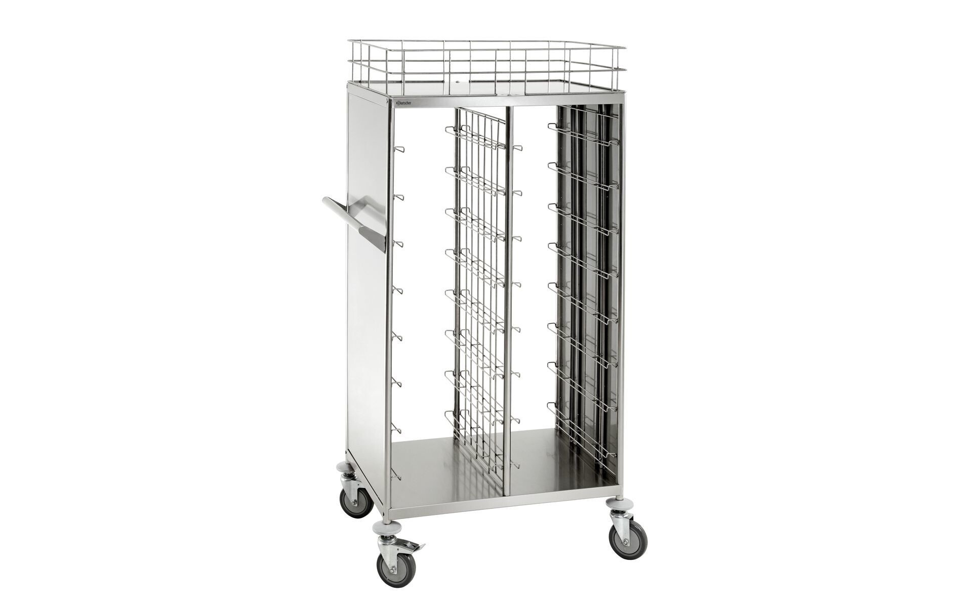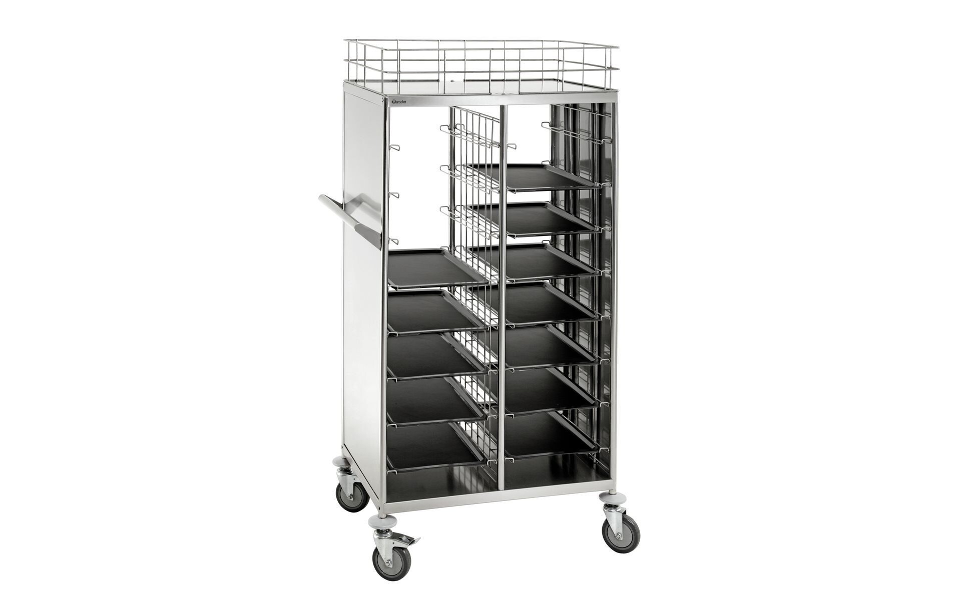 Chariot de transport polyvalent avec 16 glissières – que ce soit pour transporter des récipients GN 1/1 remplis ou pour débarrasser des plateaux au format standard de cantine.