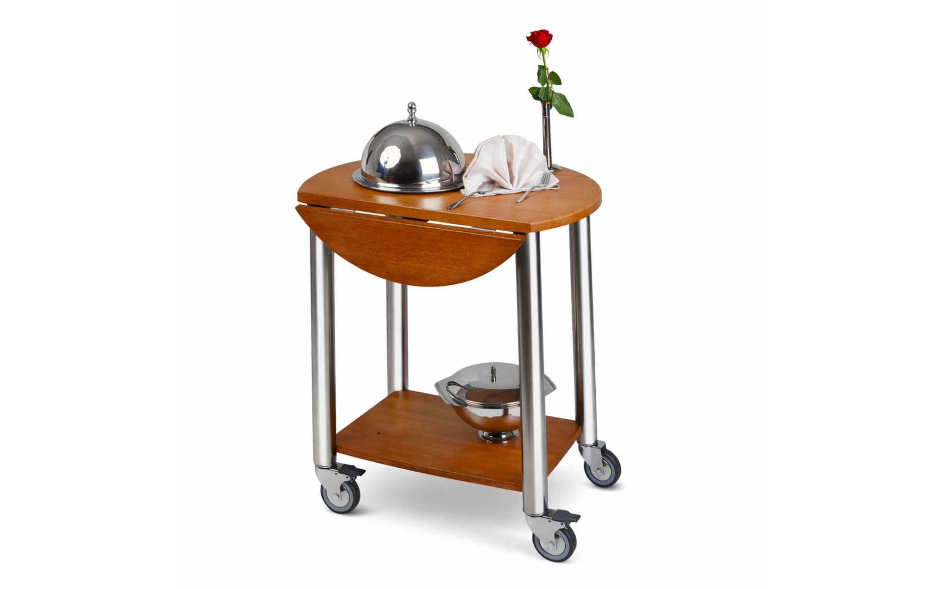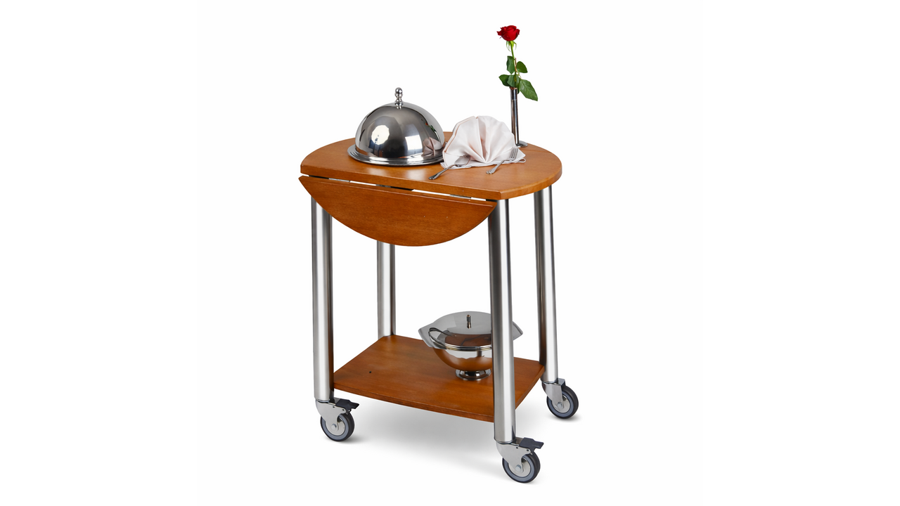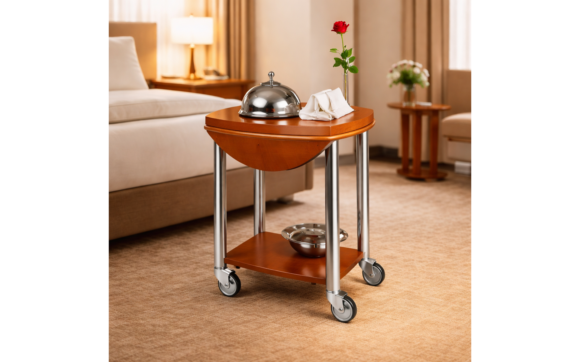 Chariot conçu pour le service en chambre, la restauration et l’usage en restaurant, doté de deux surfaces inclinables (plateau supérieur et étagère). Sa structure est adaptée à un usage professionnel dans le secteur de l’hôtellerie.