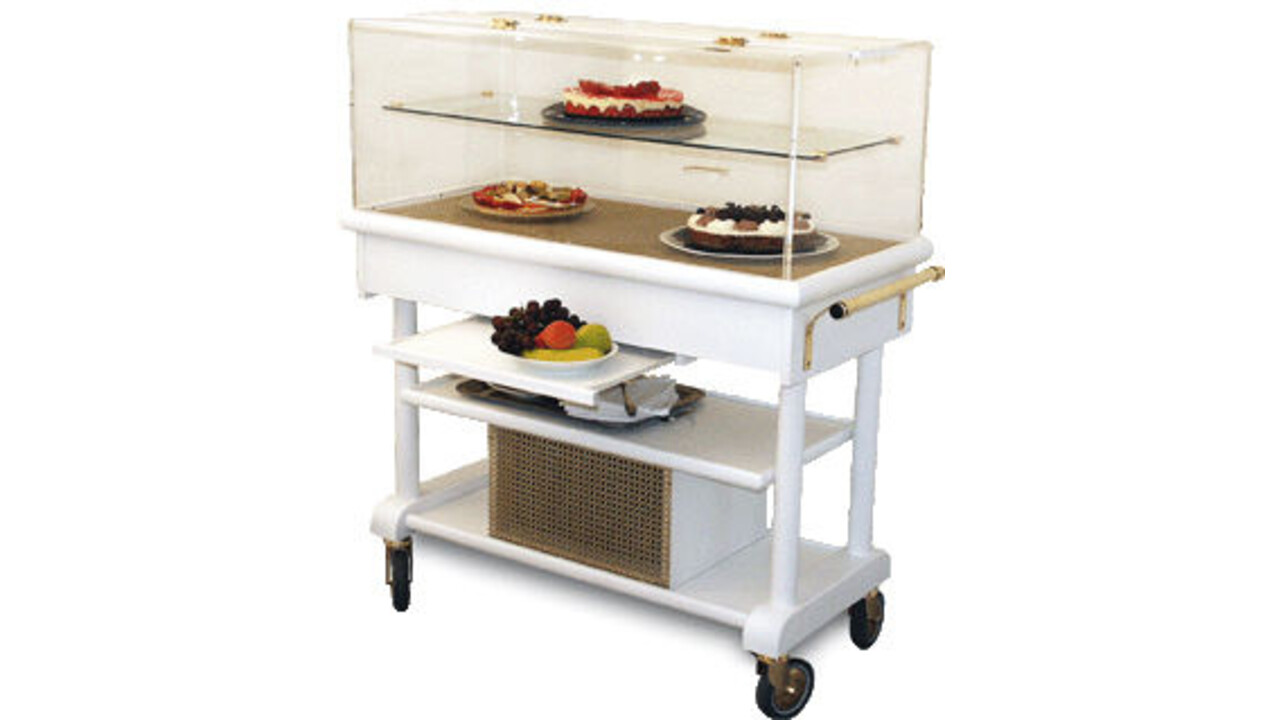 Table en bois couleur selon votre choix, petit modèle, cloche plexi avec étagère, 3 plateaux, tirette, poignées en laiton.