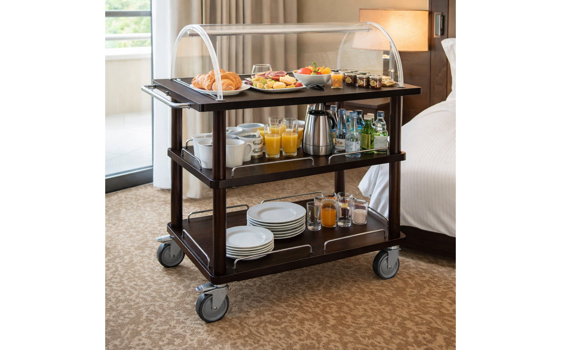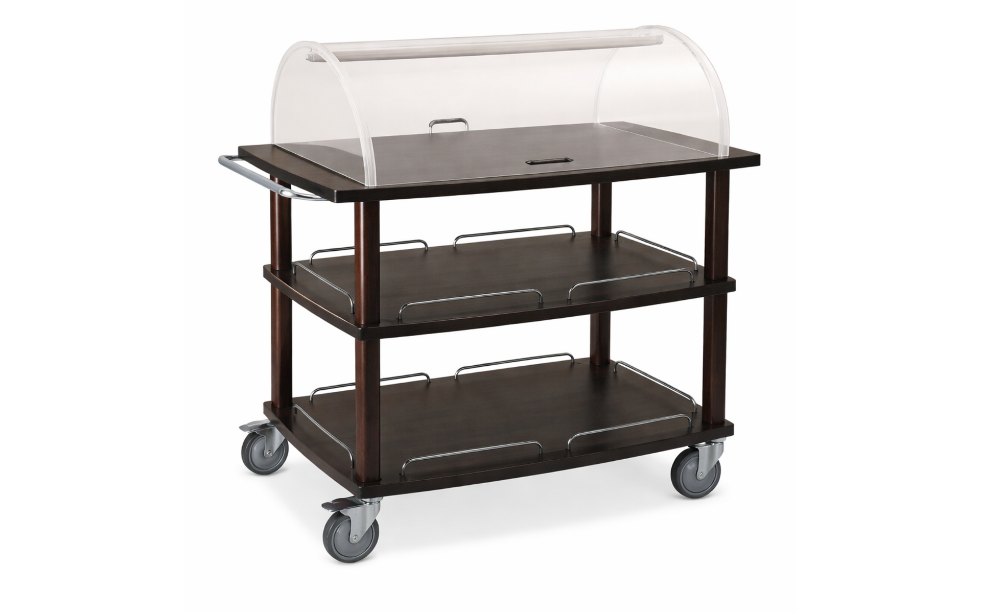 • Structure en bois massif • Étagères revêtues de mélamine • Poignée de poussée tubulaire chromée • Dôme en plexiglas semi-cylindrique ouvrant sur deux côtés • Rambardes sur les niveaux inférieurs • Roulettes pivotantes ø 12,5 cm