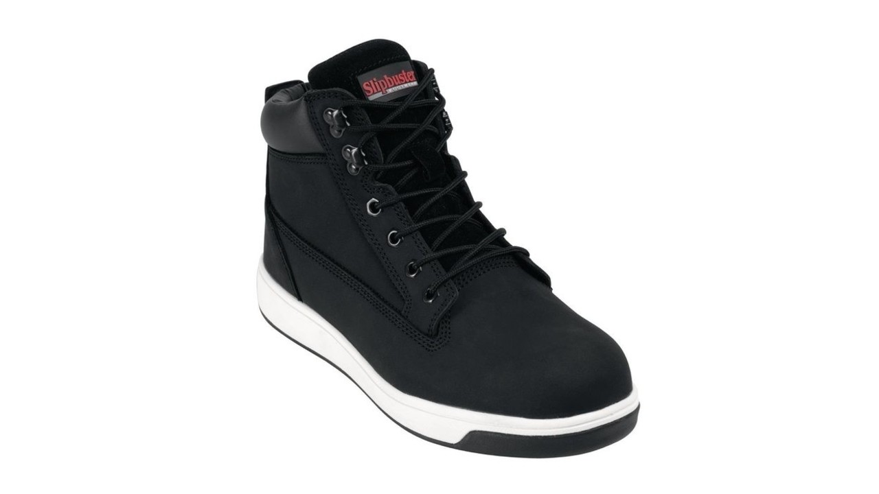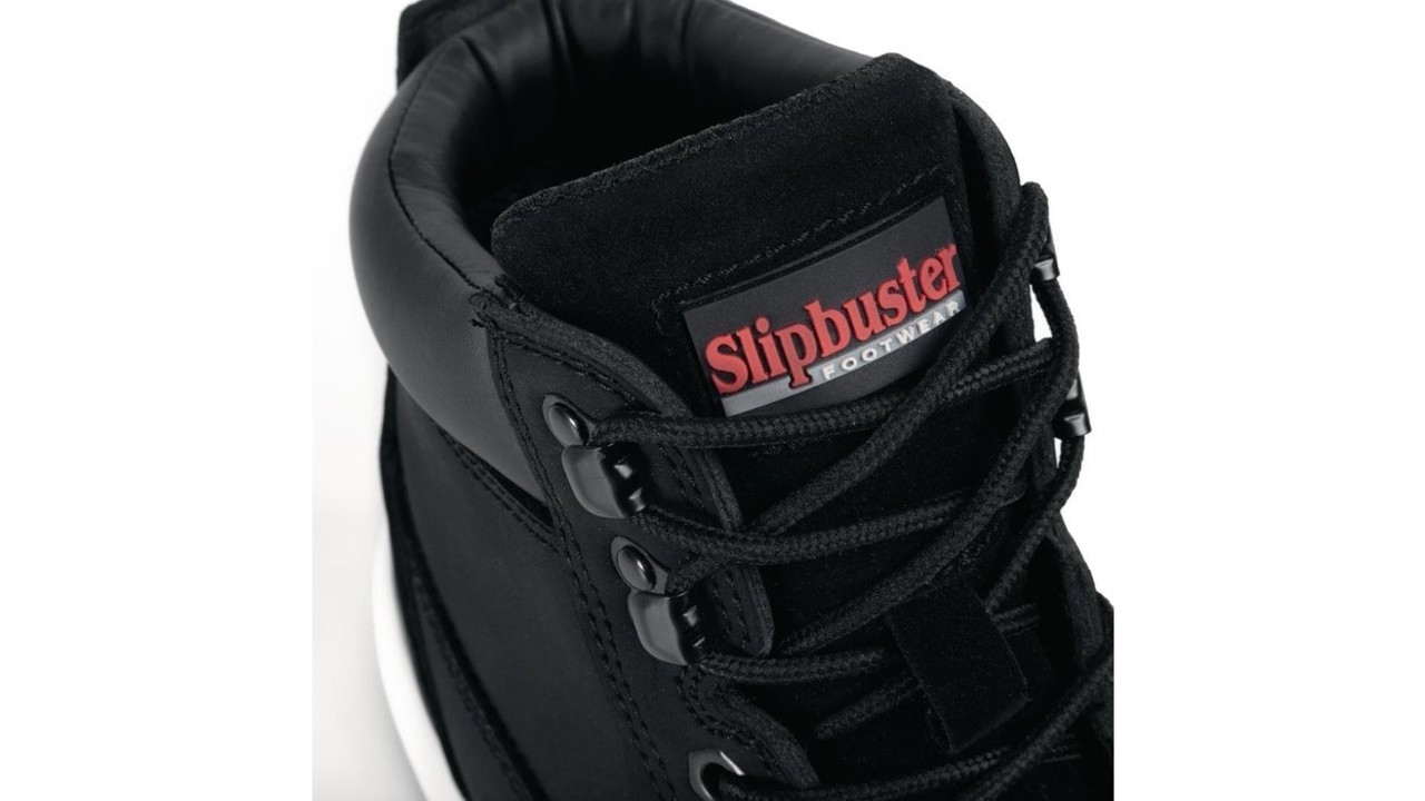 Chaussures de sécurité montantes en cuir de la marque professionnelle Slipbuster. Confortables et résistantes, elles sont certifiées norme SRC pour une efficacité anti-dérapante.