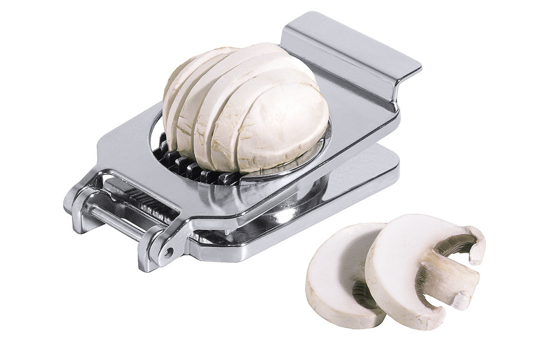 Fabriqué en zinc moulé, chromé, couteau de scie en acier inoxydable 18/0, qualité lourde, coupe les champignons en tranches d'environ 5 mm d'épaisseur. Dim. 13 x 7 cm