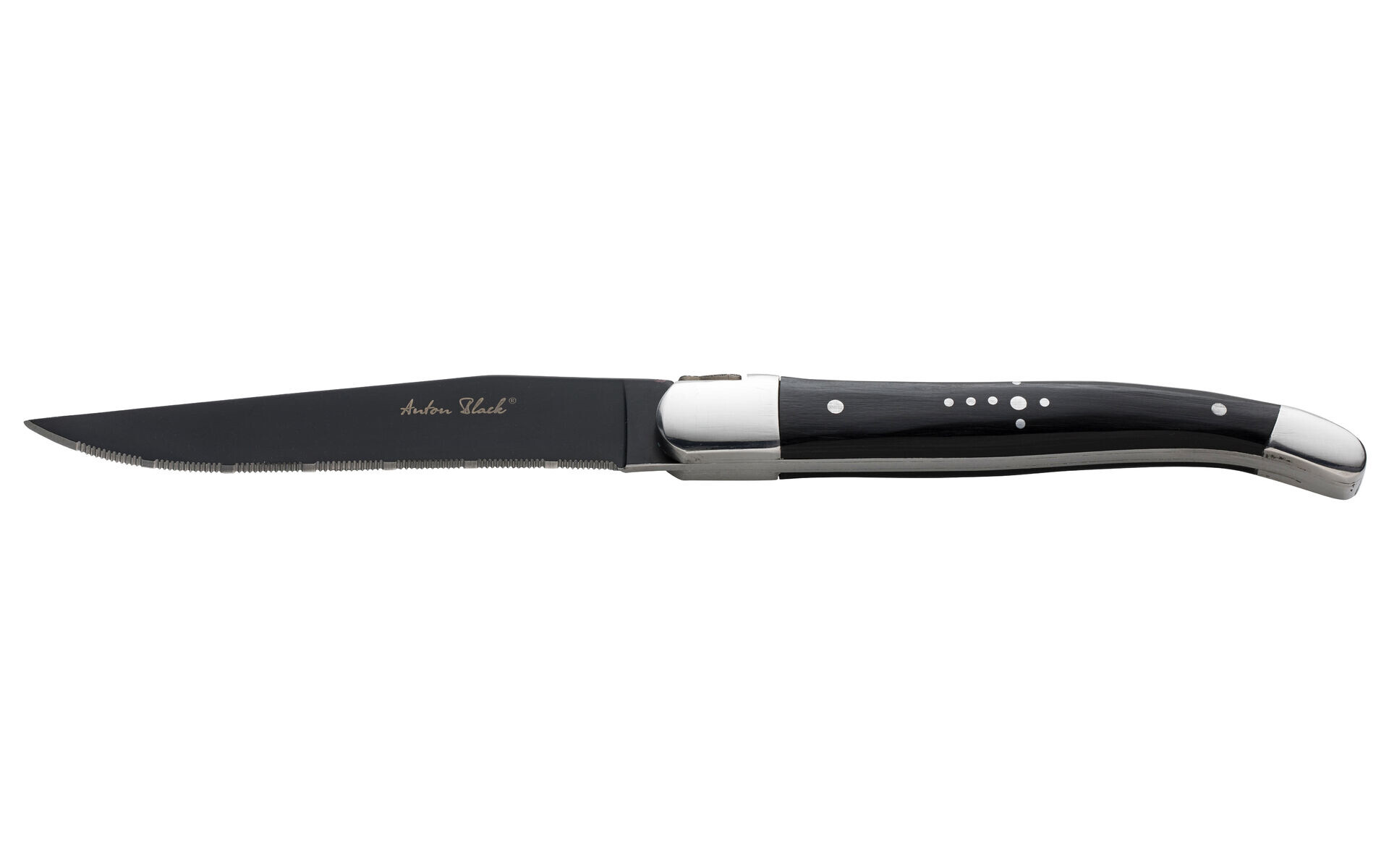 Cette version moderne et accrocheuse du couteau à steak à manche en lâme noires a une grande présence sur n'importe quel décor de table.