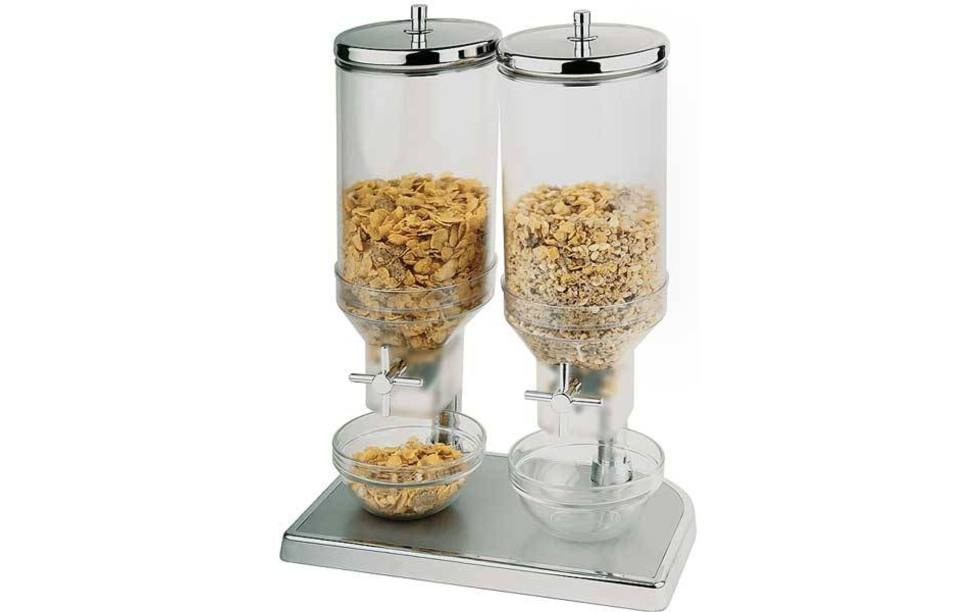 Distributeur à céréales double 2 x 4,5 litres Corps en plastique lavable au lave-vaisselle avec couvercle en acier inoxydable 18/10 et une base chromée. Le mécanisme de robinet fournit les portions mesurées. Idéal pour les buffets de petit-déjeuner ...