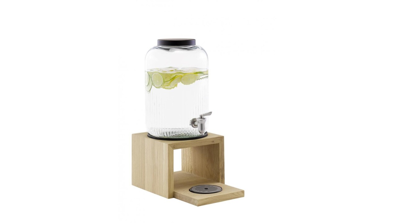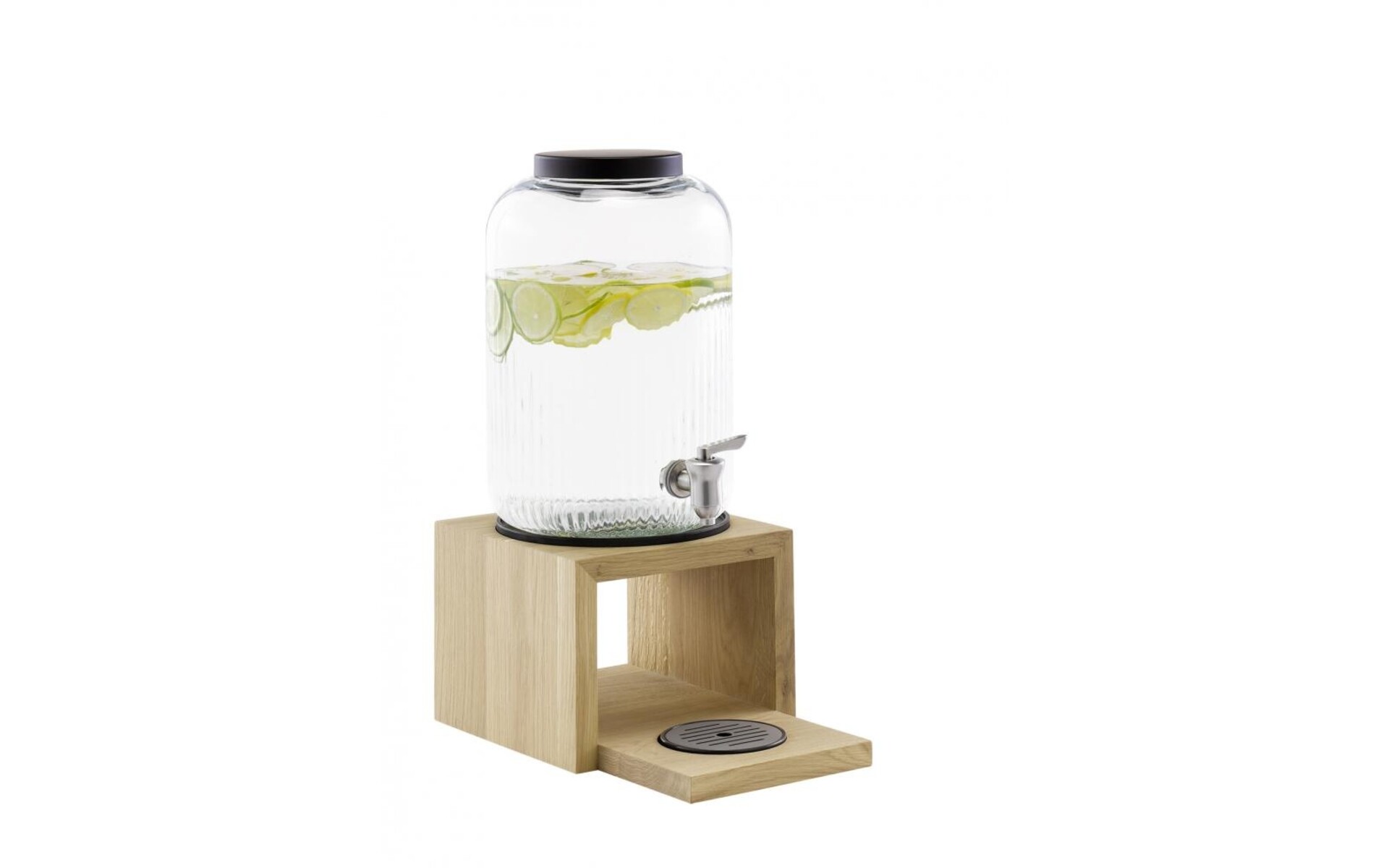 Support en bois de chêne laqué imperméable, languette anti-goutte en acier inoxydable, dessous de verre en mélamine et plaque de base amovible. Pieds antidérapants. Récipient en verre de 7 litres.