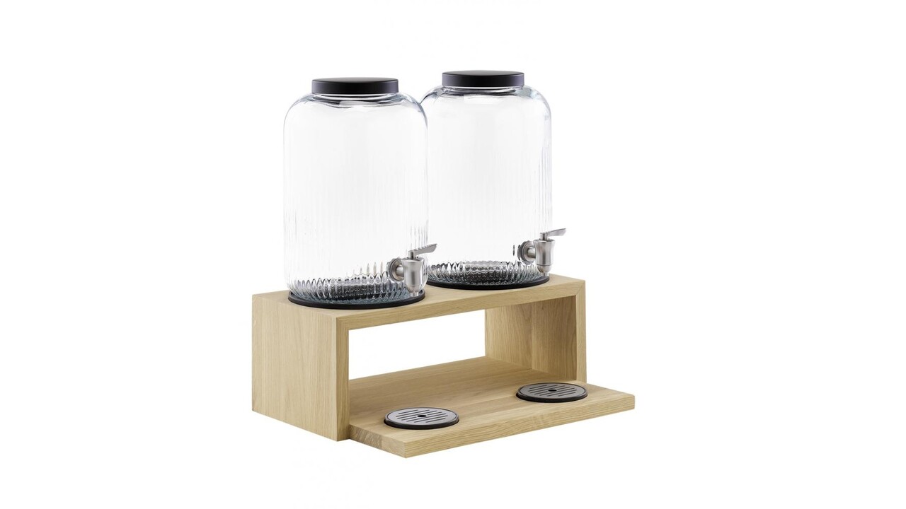 Support en bois de chêne laqué imperméable, languette anti-goutte en acier inoxydable, dessous de verre en mélamine et plaque de base amovible. Pieds antidérapants. Récipient en verre de 2 x 7 litres.