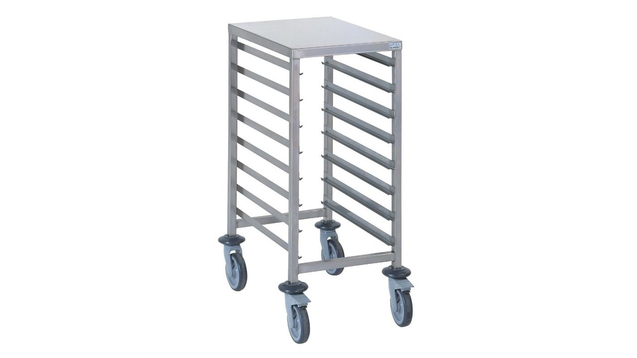 Construction en acier inoxydable soudé avec 8 niveaux pouvant accueillir plaques, bacs ou paniers GN 2/1 avec tablette.