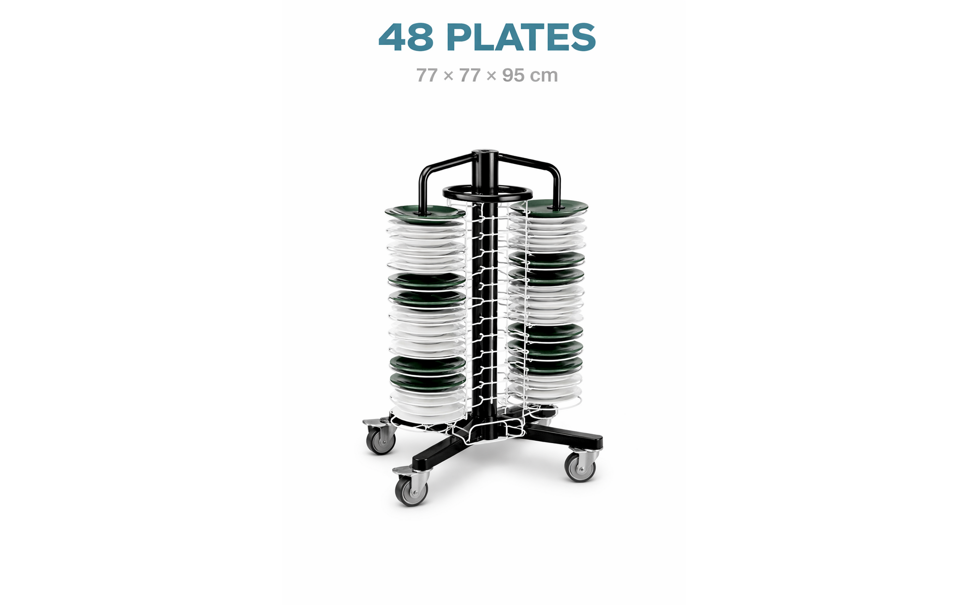• Structure en acier avec revêtement en poudre époxy noir • Supports d’assiettes en acier avec revêtement plastique rilsan blanc • Poignées de poussée • Roulettes pivotantes, ø 12,5 cm, dont 2 avec frein