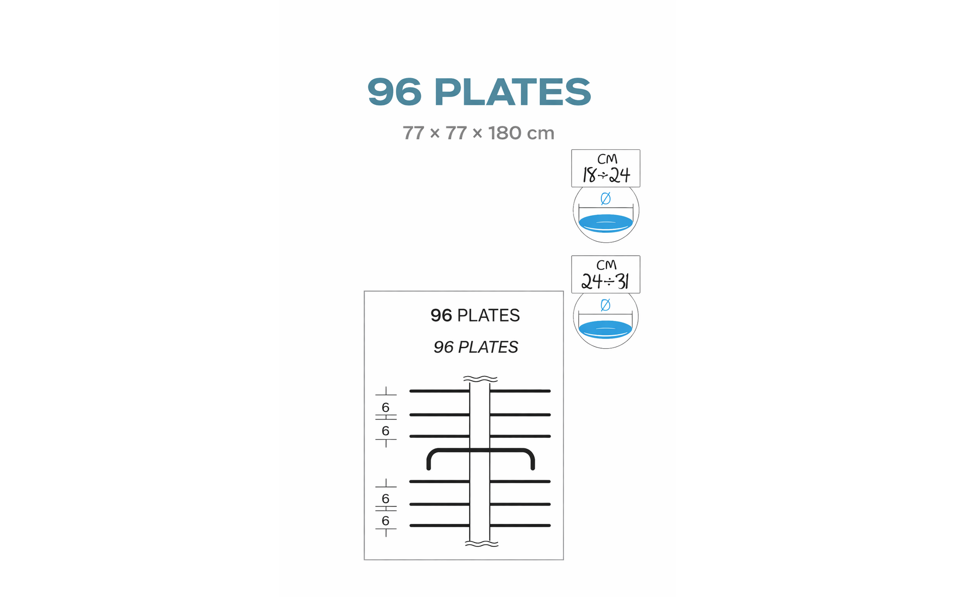 Les dimensions de l’empileur d’assiettes varient selon la capacité. Les modèles pouvant contenir 96 assiettes mesurent 77 × 77 × 180 cm, tandis que les modèles pour 48 assiettes sont plus compacts avec des dimensions de 77 × 77 × 95 cm, idéals pour les espaces nécessitant moins de stockage.