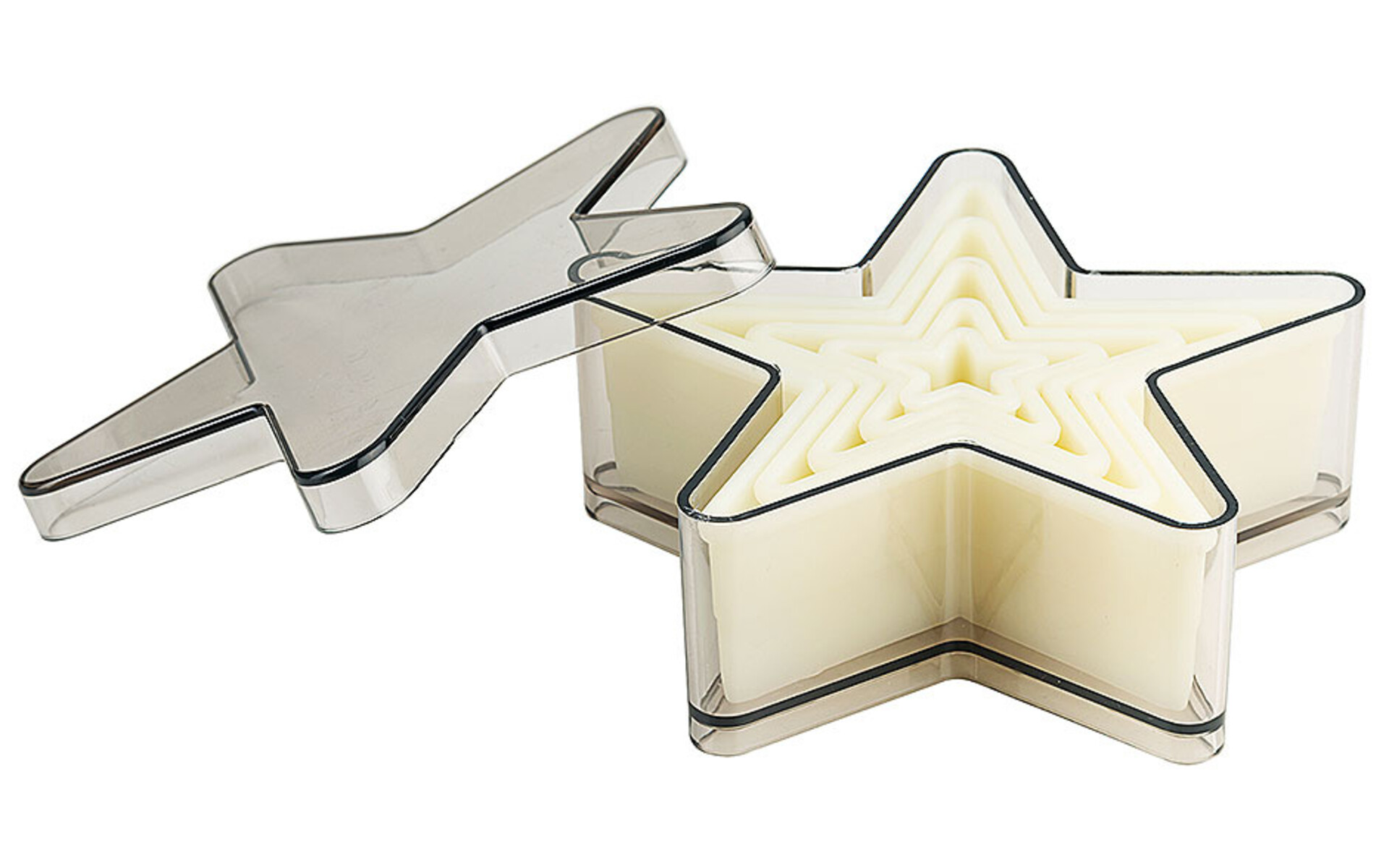Set de 5 emporte-pièces "étoile " unis en plastique Exoglass® blanc. Dimensions : 2,2 à 12 cm. Hauteur 3,5 cm. Résistant à la chaleur jusqu'à +160°C, pratiquement incassable.