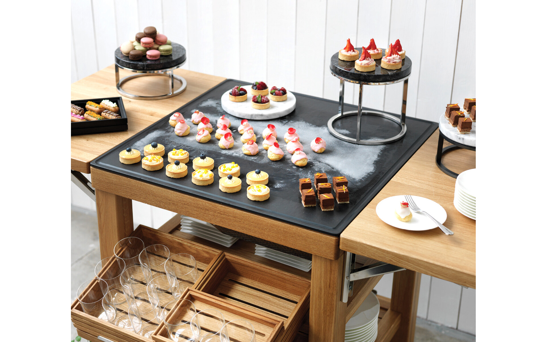 Le chariot Flow Hot and Cold offre une double fonctionnalité de refroidissement et de chauffage Avec son système d'étagères coulissantes, son tablier coulissant et ses roulettes, ce chariot est idéal pour les buffets ou les présentoirs.