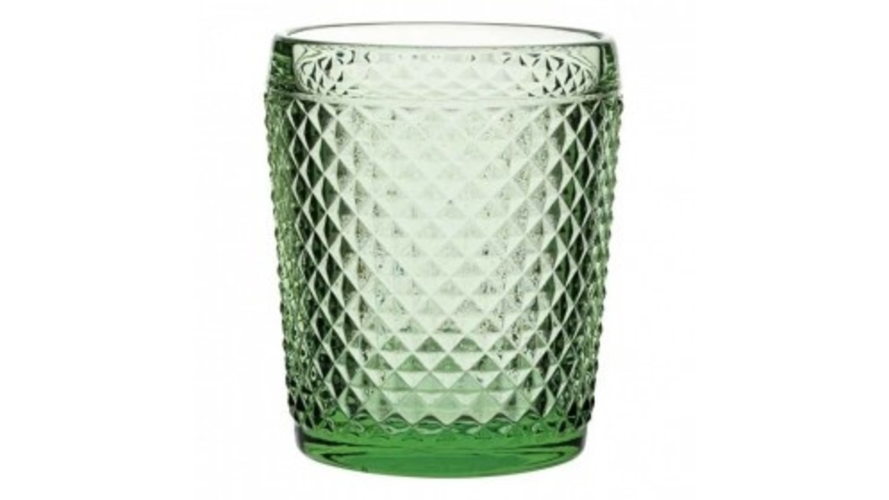 Gobelet à cocktail texturé et taillé. Coloration verte. Matière : Verre sodocalcique. Compatible au lave-vaisselle. Parfait pour les cocktails et pour servir de l'eau.