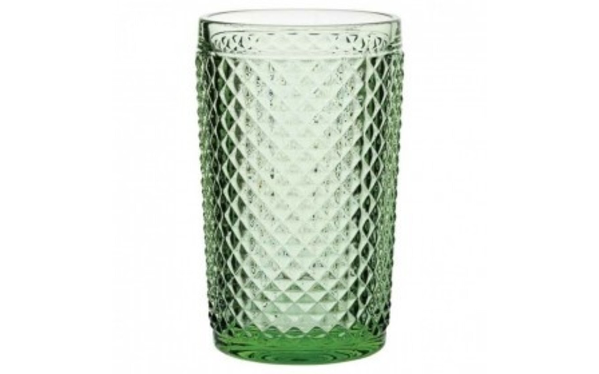 Gobelet haut à cocktail texturé et taillé. Coloration verte. Matière : Verre sodocalcique. Compatible au lave-vaisselle. Parfait pour les longdrink, cocktails et pour servir de l'eau.