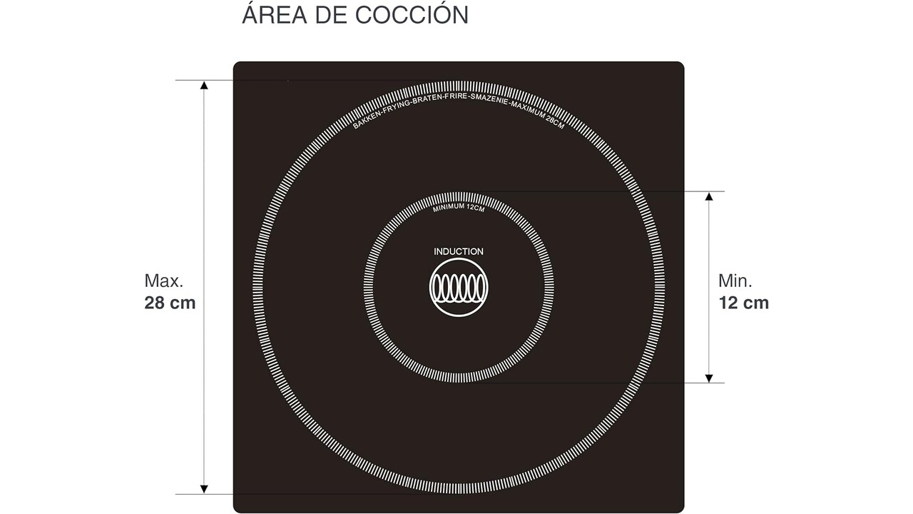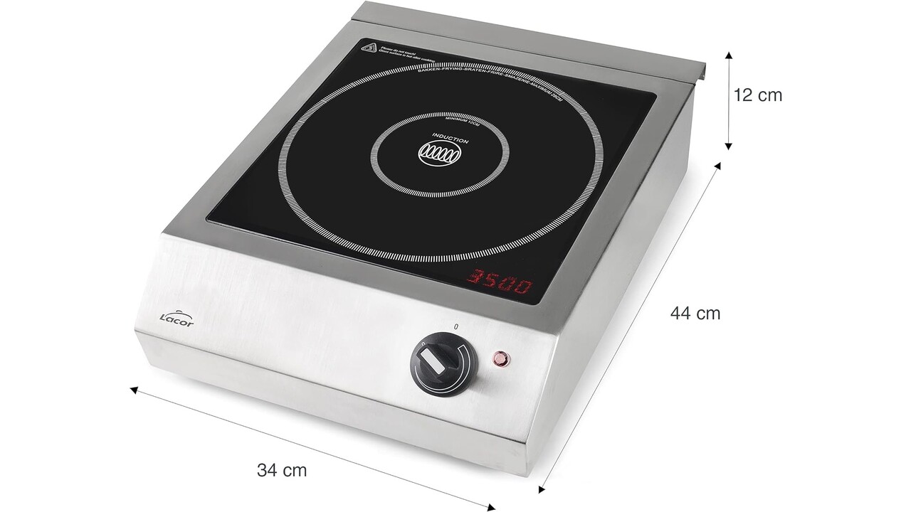 Convient aux casseroles et poêles à induction entre Ø12cm et Ø28cm. Dimensions : 34x44x12 cm.