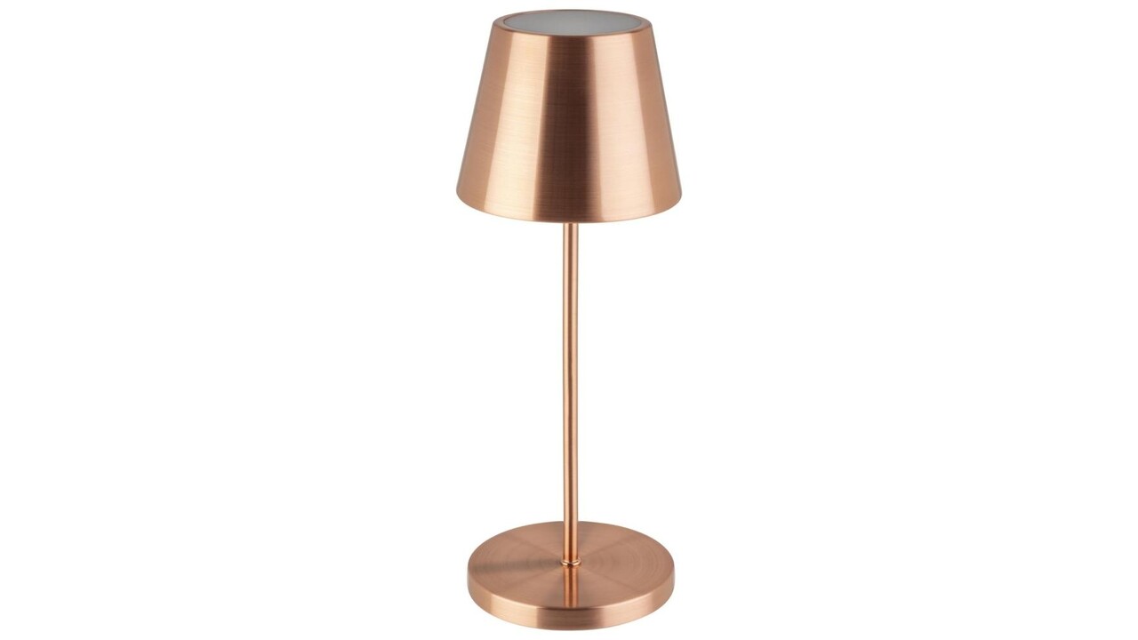Couleur : cuivre , 1x LED 2,0 W / 180 lm, dimmable sur 3 niveaux, CCT : 2.200 / 2.700 / 3.500 K, batterie Li-ion 5.000 mAh, protection contre les éclaboussures IP54, temps de charge : 8h, durée d'éclairage : 10h (100% de luminosité), durée d'éclairage max. : 54h (luminosité la plus faible), câble de charge USB A vers USB C.