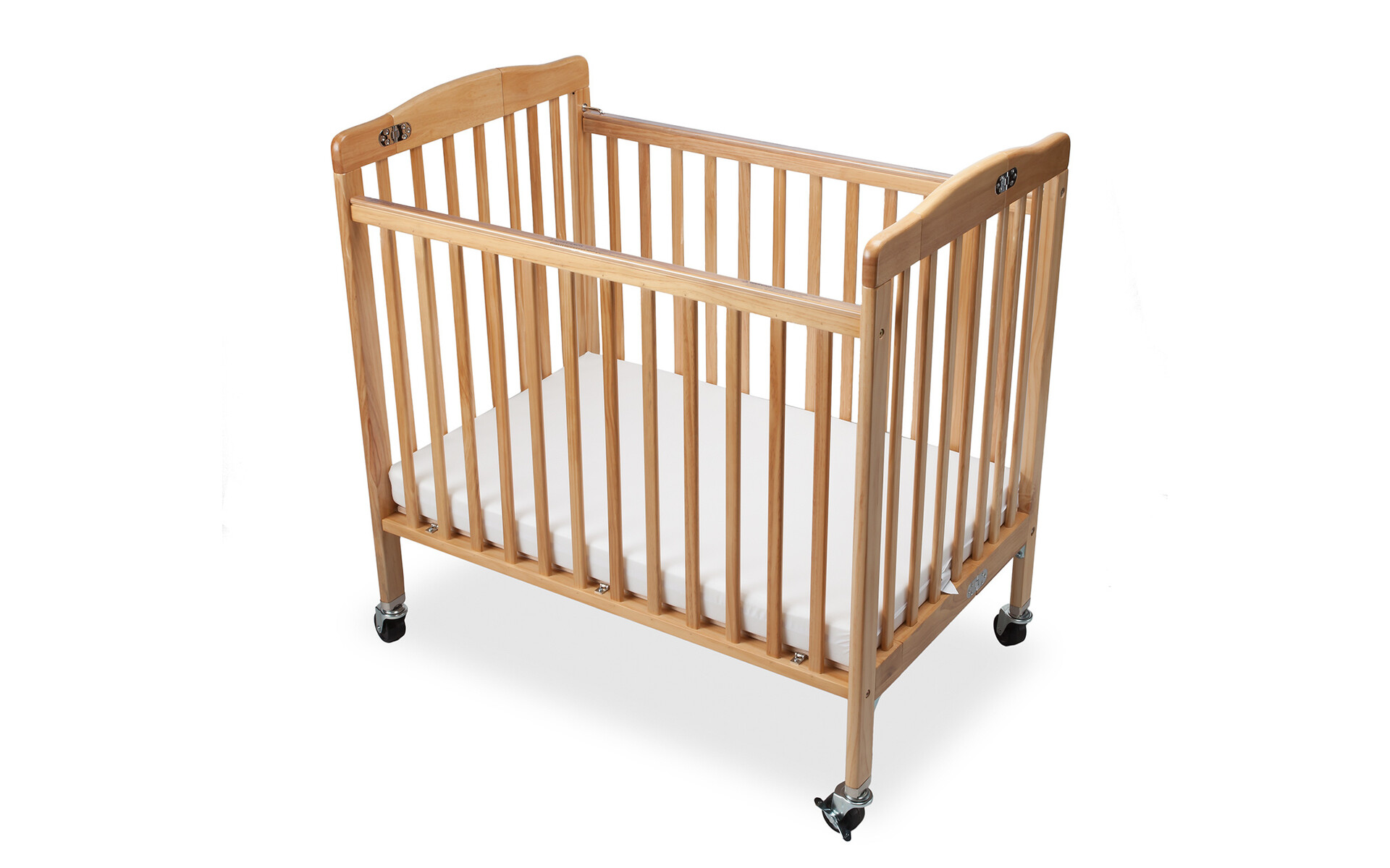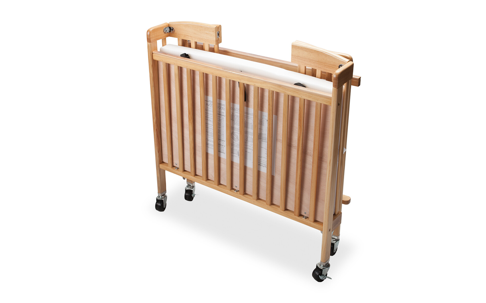 Fabriqué en bois dur épais et durable. Sommier et matelas rangés dans le lit en position repliée. Conforme à la norme CPSC 16 CFR 1220 Certifié JPMA (conforme aux exigences légales américaines les plus récentes).