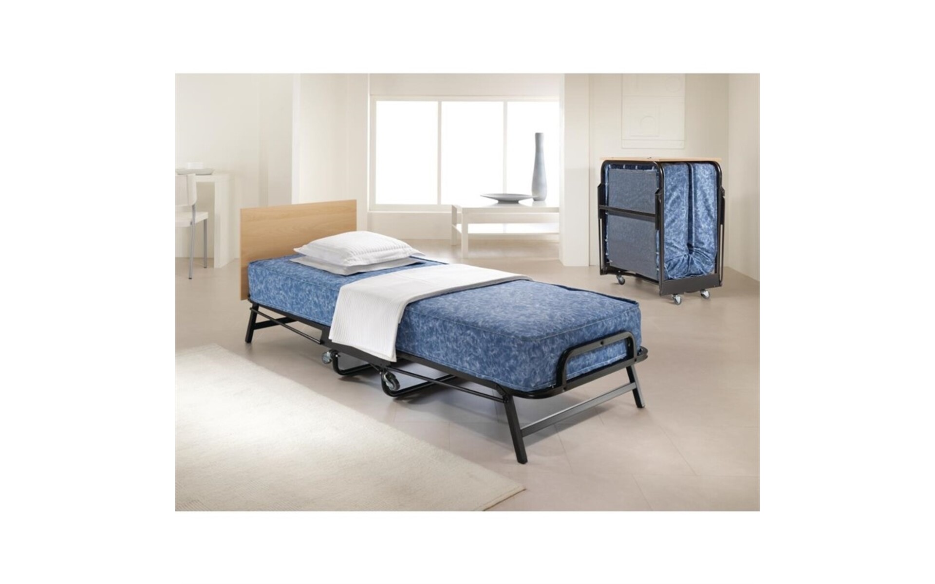 Ce lit pliant simple très résistant JAY-BE offre confort et commodité avec une base en maille carrée robuste et un matelas à ressorts profonds, conçu pour faire face aux exigences d'une utilisation régulière. Le cadre en acier épais est également conçu pour offrir une grande durabilité, tandis que le matelas étanche est entouré d'un tissu lisse de haute qualité pour le maintenir en parfait état. Répondant aux normes de sécurité européennes, ce lit pliable de fabrication britannique est facile à nettoyer et très maniable grâce à quatre roulettes fiables, permettant un mouvement à 360 degrés.