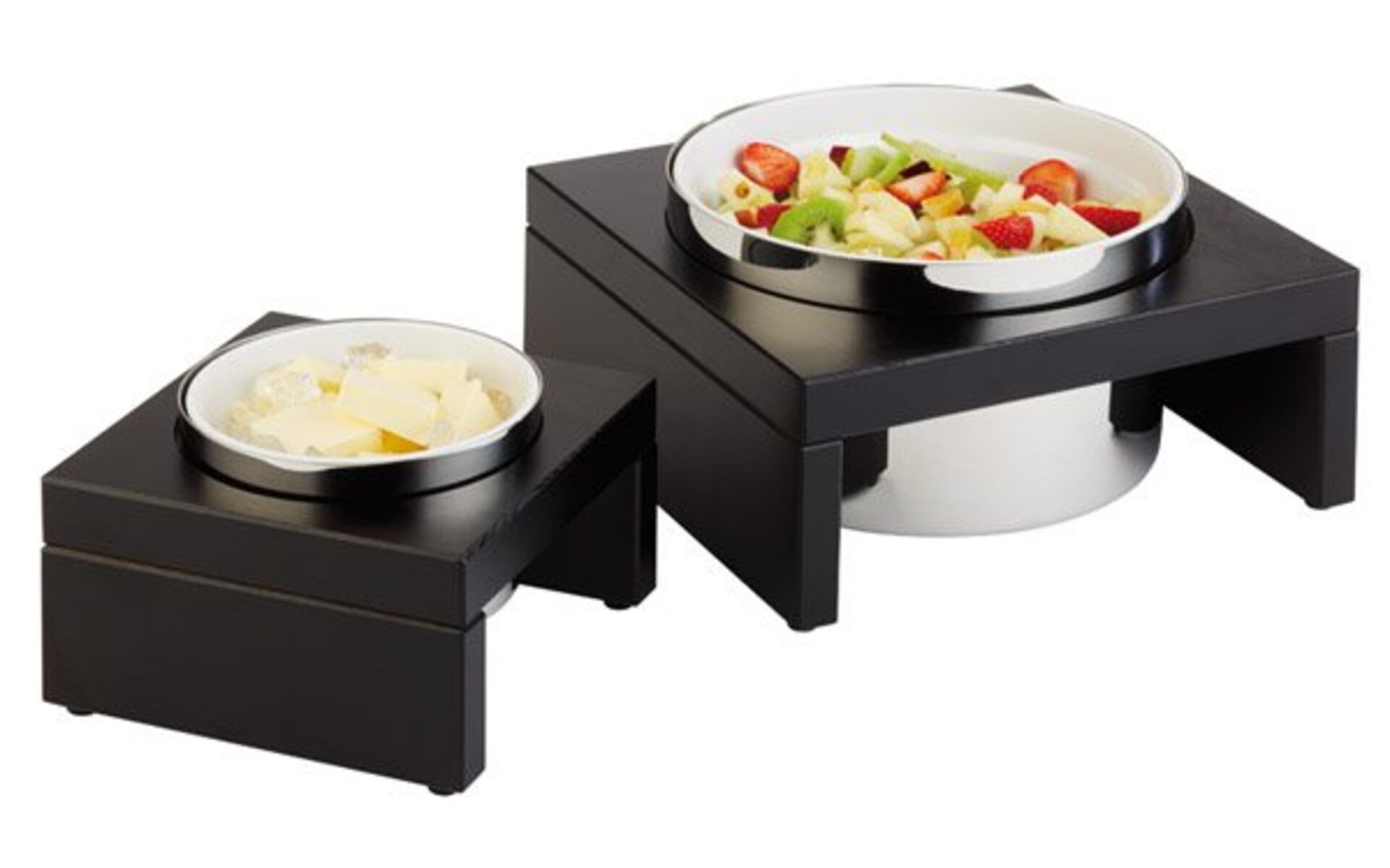 Ce présentoir comprend une base en wengé, un récipient en acier inoxydable, un bol en mélamine blanche de 23 cm, 2,50 litres et un élément de refroidissement.