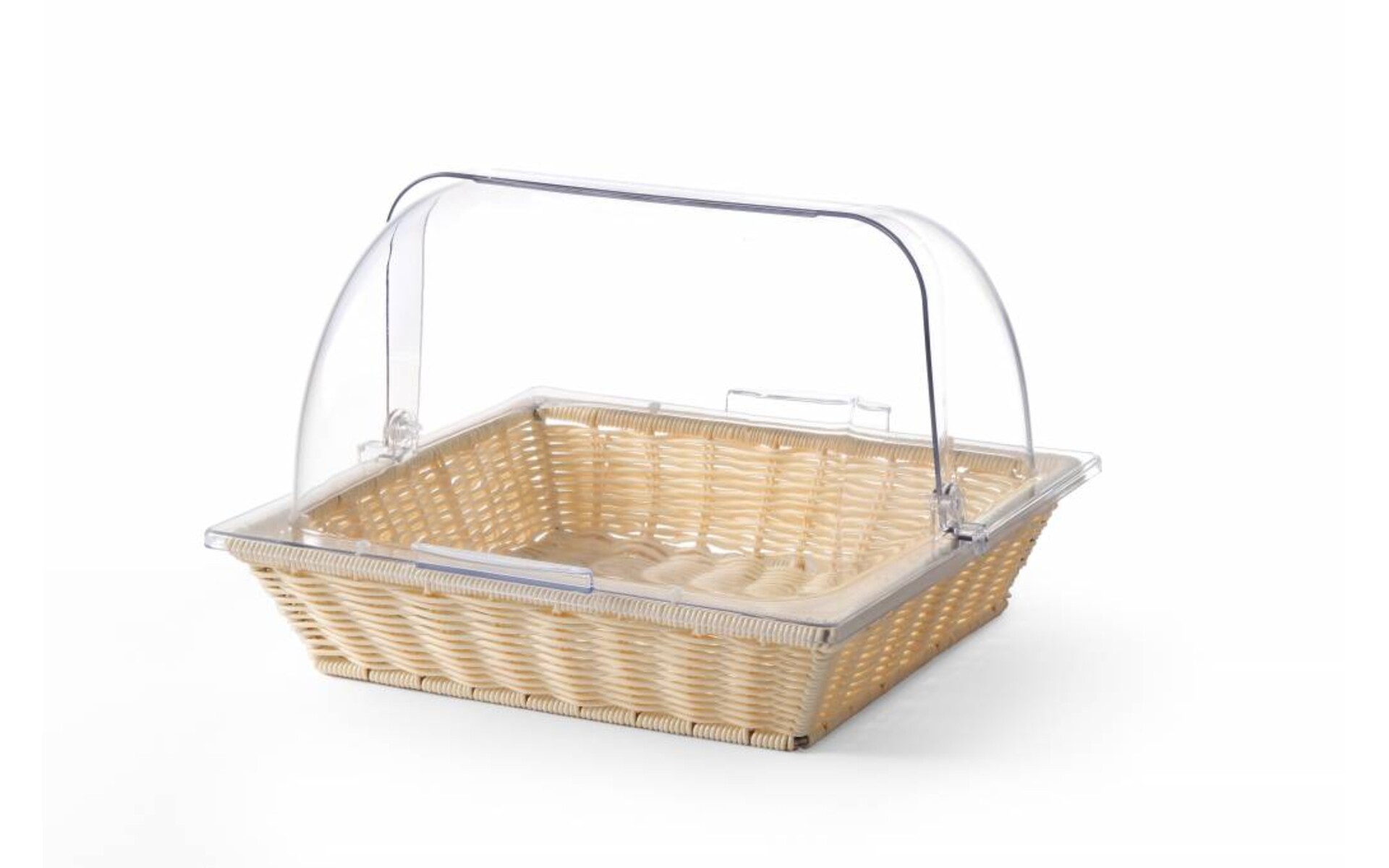 Dim 365x335x(H)245 mm Corbeille en polypropylène renforcé (poly-rotin). Couvercle rolltop en polycarbonate.