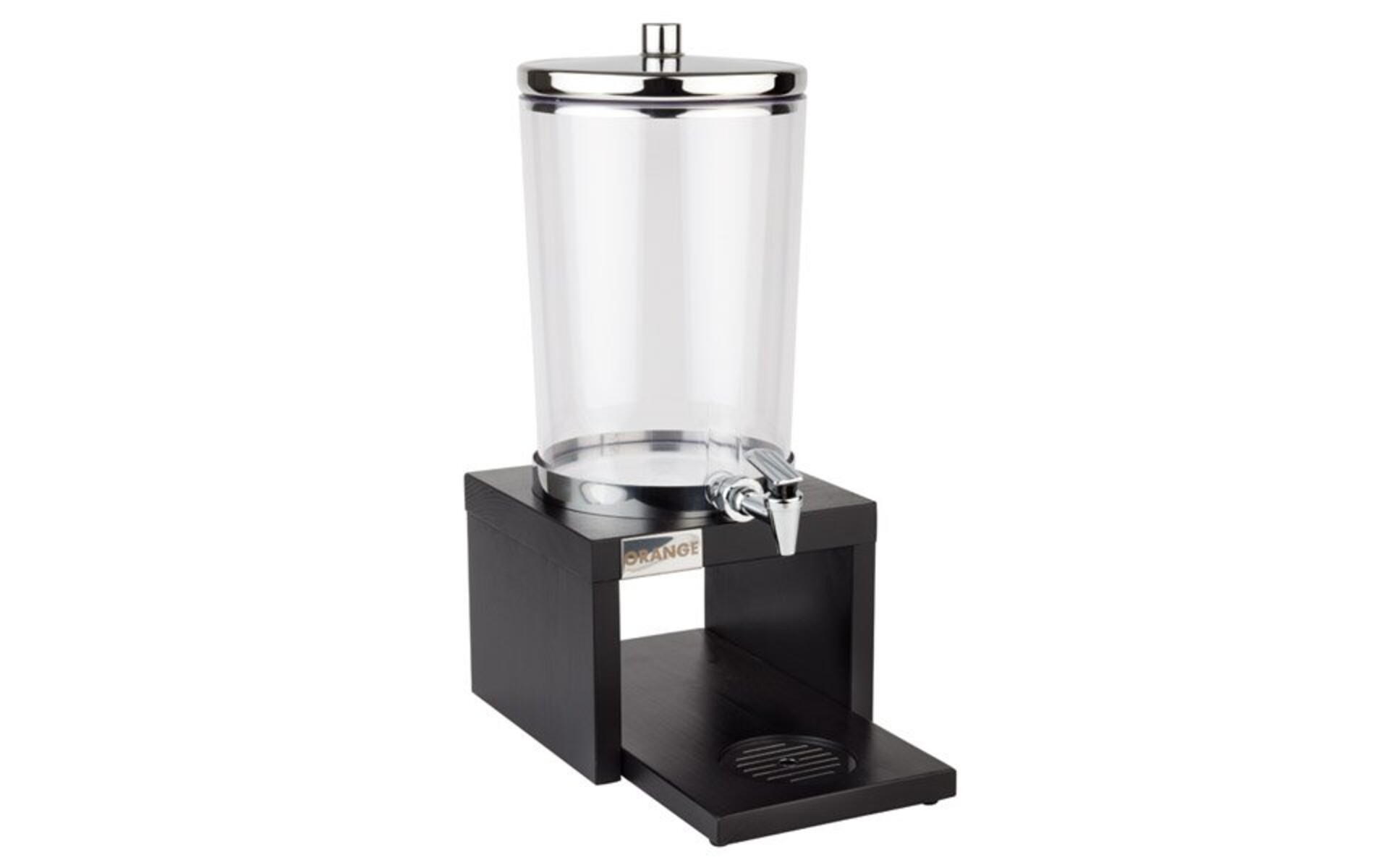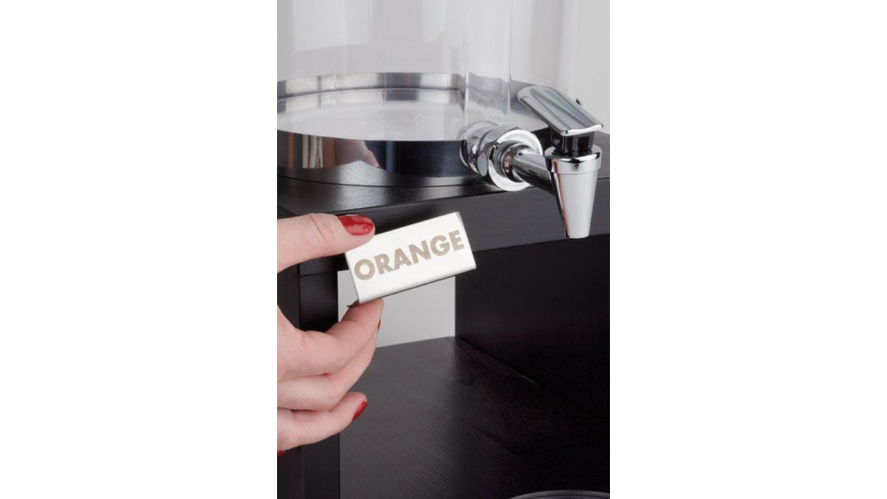 Présentoir en wengé avec récipient à jus en plastique 6 litres avec couvercle et robinet en acier inoxydable, deux éléments de refroidissement (un pour le couvercle et un dans le socle) Y compris 3 plaques magnétiques (avec inscription : orange, pomme et pamplemousse)