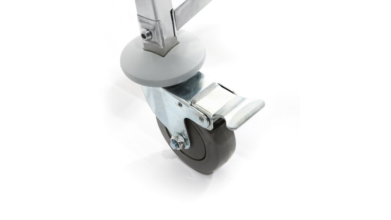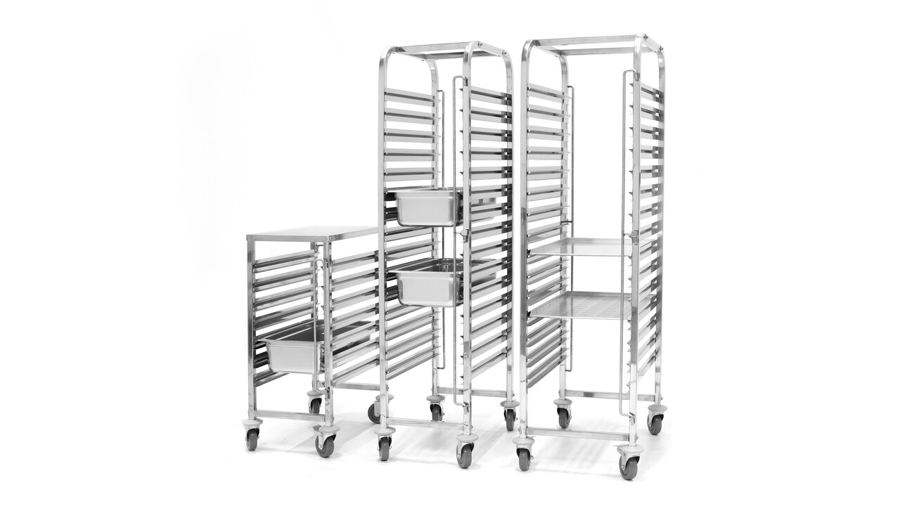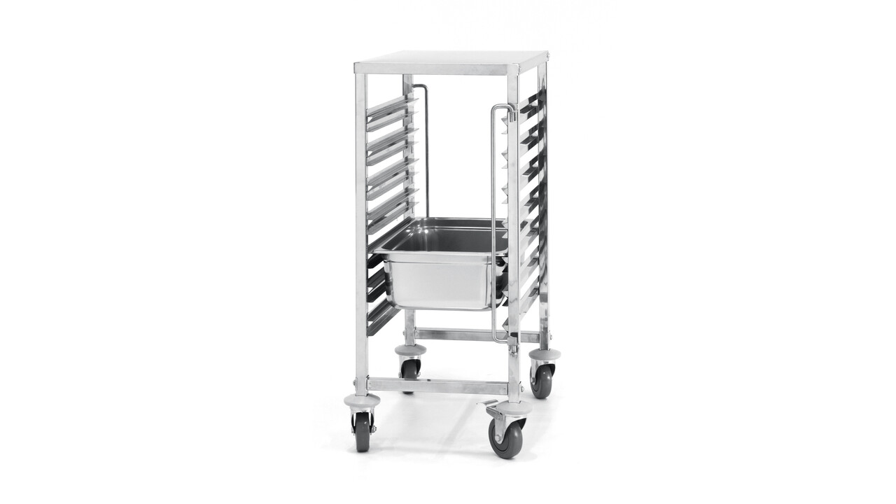 Pour 7 bacs ou plaques GN 1/1. Avec surface de travail. Verrouillage des plateaux sur les deux côtés. Avec 4 roues pivotantes, 2 avec frein. Dim. 445 x 615 x (H)945 mm.