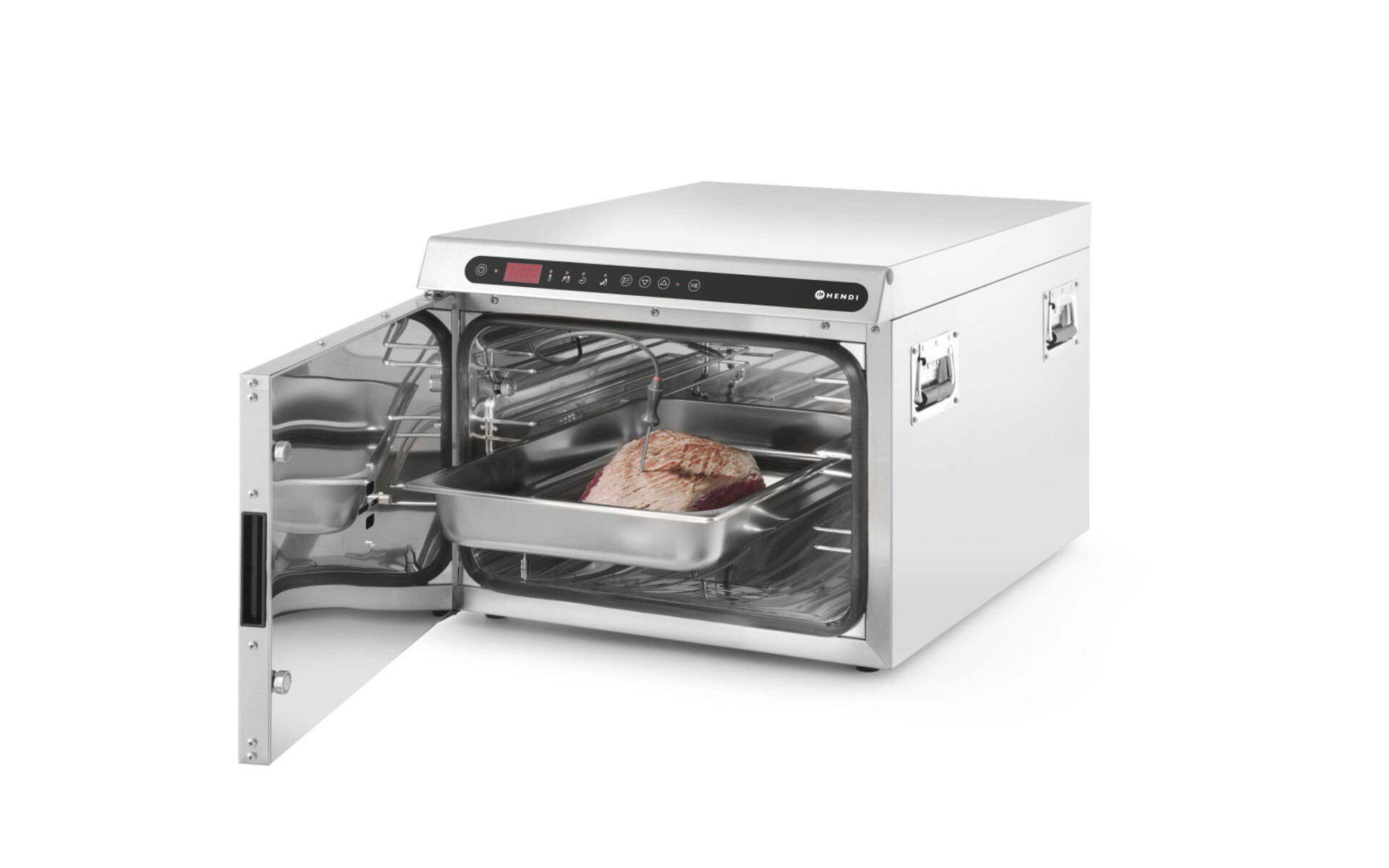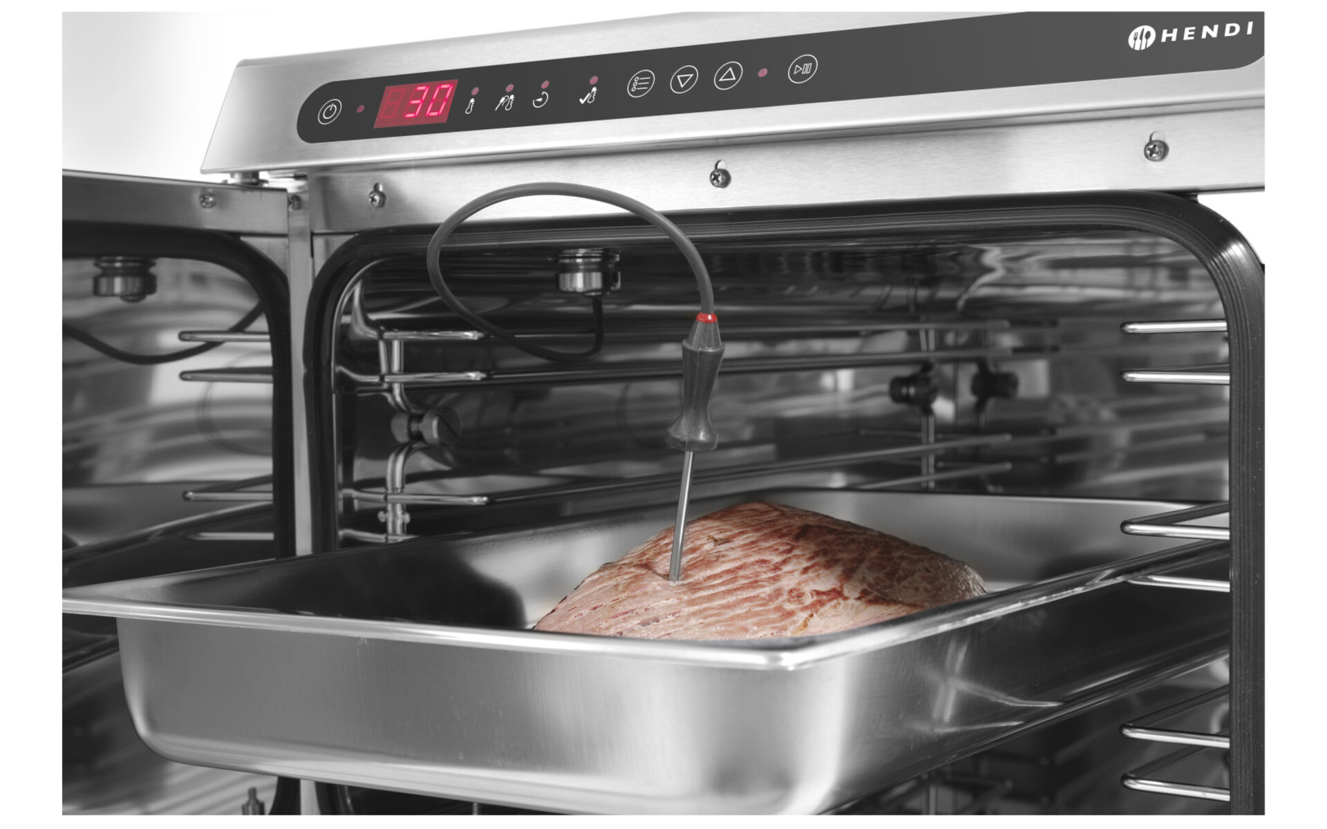 Conçu pour la cuisson à basse température où le processus peut être réglé et contrôlé très précisément. Avec une sonde de cuisson, réglable séparément.