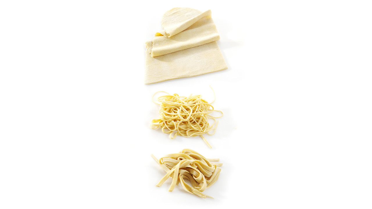 Idéal pour préparer des pâtes fraiches (largeur maximum : 170 mm). Épaisseur réglable en 7 étapes de 0,2 à 2,5 mm. Trois rouleaux/couteaux en alliage d'aluminium: rouleau à pâte, couteau tagliatelle (6,25 mm) et couteau fettucine (2 mm).
