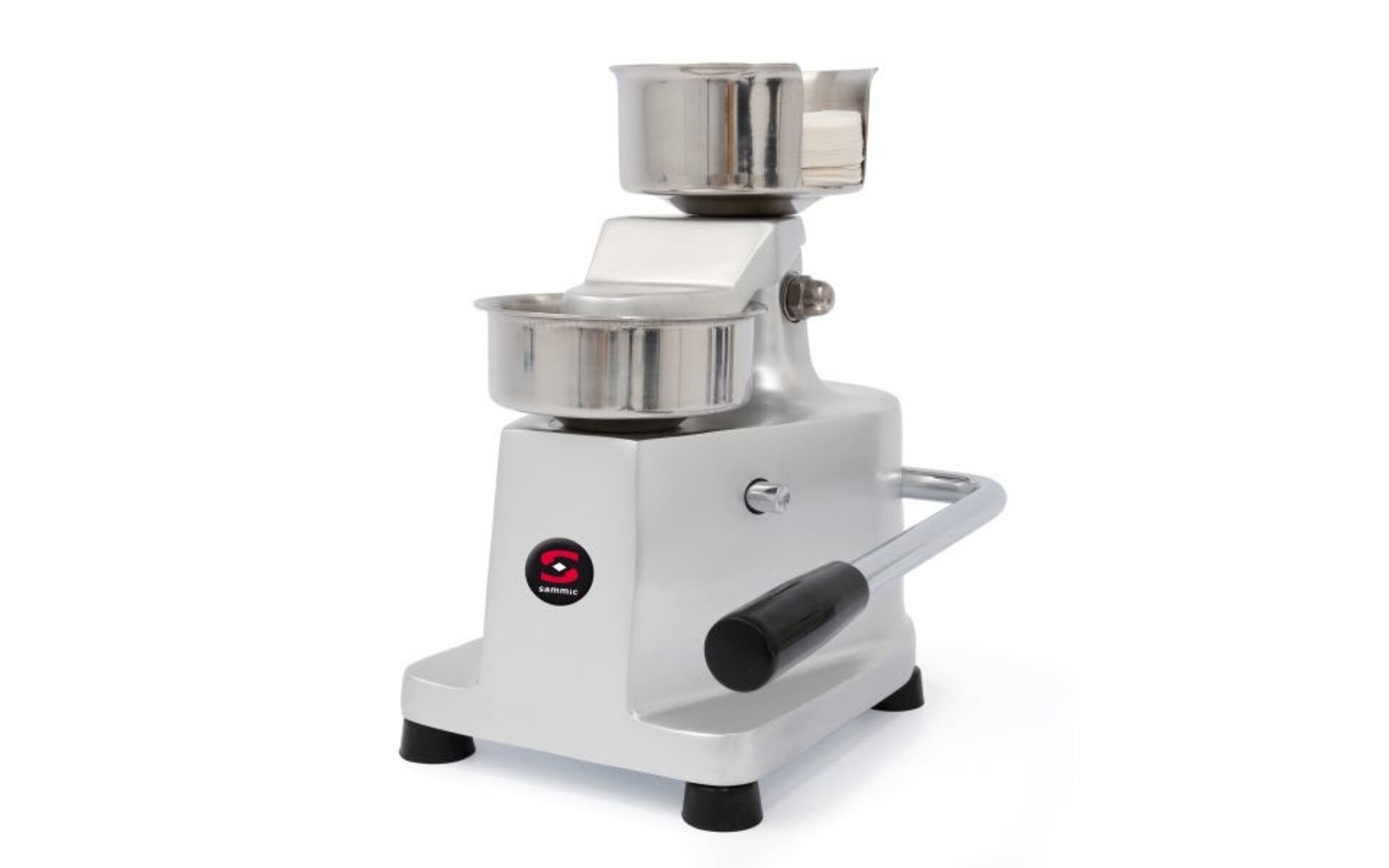 Conçu pour former des hamburgers de Ø 100 mm. x 25 mm. Moule à hamburger au design épuré, simple à utiliser et à entretenir. Conçu pour mouler les hamburgers rapidement et de manière hygiénique grâce au distributeur de cellophane de protection intégré.