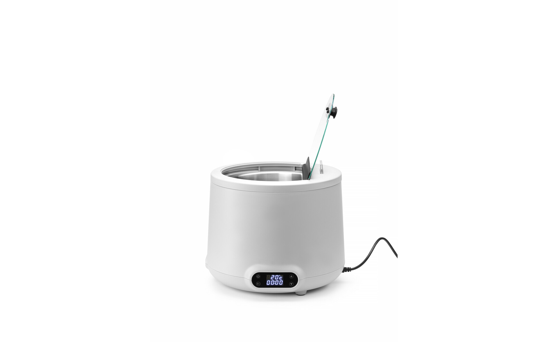 Couvercle en verre trempé avec poignée isolante, emplacement pour cuillère et charnière en aluminium.