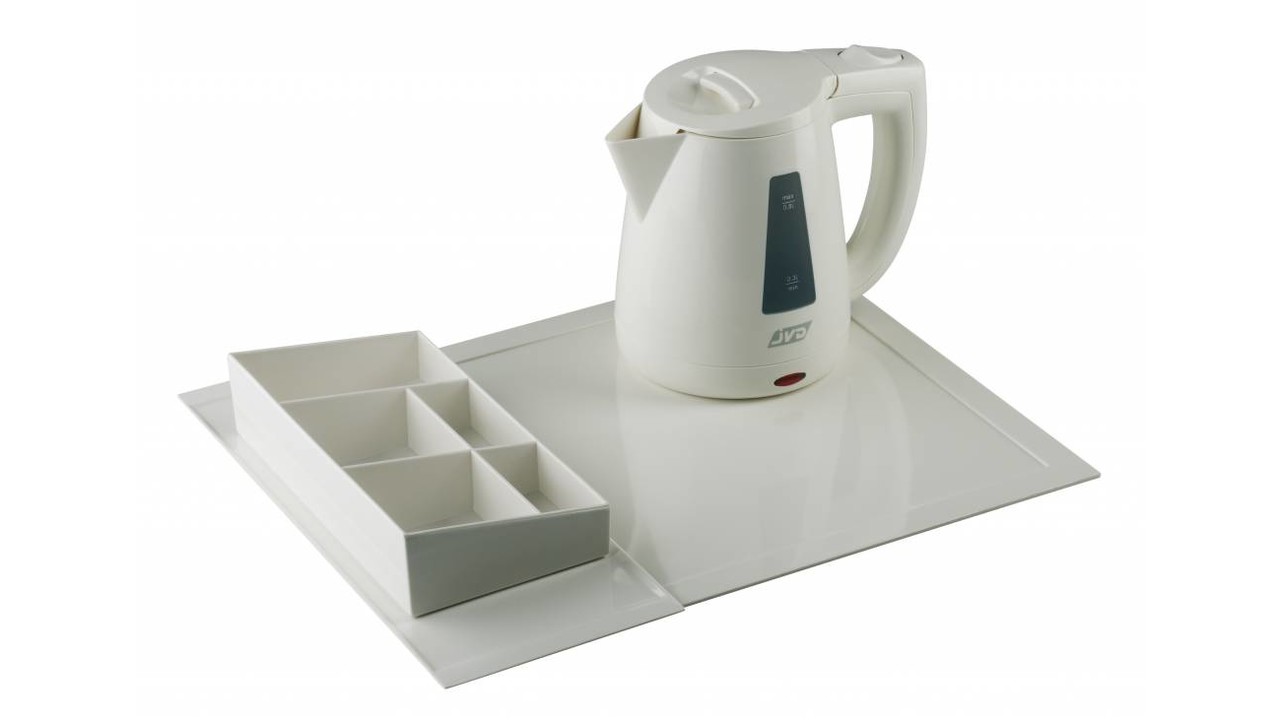 Ce set se compose d'une bouilloire de 0,80 litres, rotation à 360° su socle. Puissance nominale 1100 W Tension d'alimentation 230 V 3 Plateaux sont compris un plateau 377x278x25mm un plateau de service 327x133x10mm et un support sachet sucre/thé ...