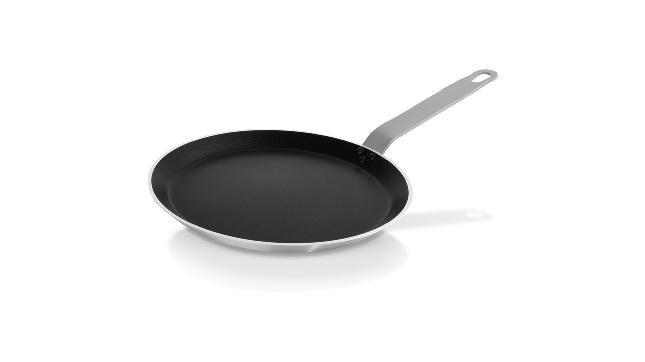 Avec revêtement anti-adhésif PTFE, base à plat et poignée en fer riveté.