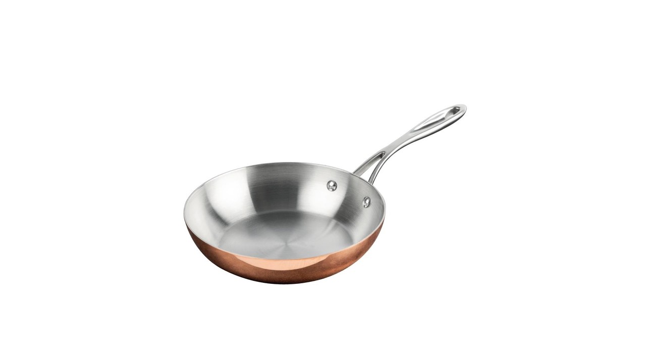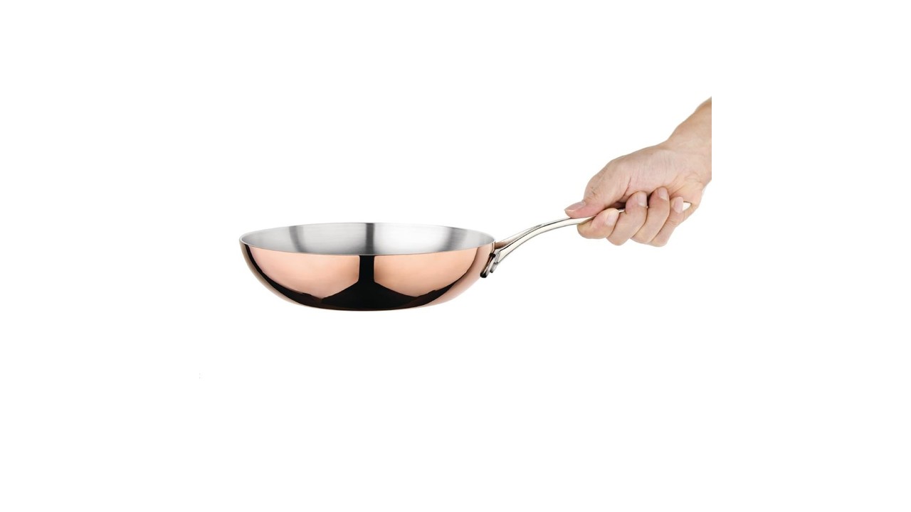 Pole à frire triple épaisseur de haute qualité, intérieur aluminium entouré d'acier inoxydable, et couche extérieure cuivre. La construction 3 couches permet une distribution uniforme de la chaleur et des résultats de cuisson homogènes. Intérieur finition brossée et extérieur cuivre lisse brillant pour un rendu traditionnel et élégant.
