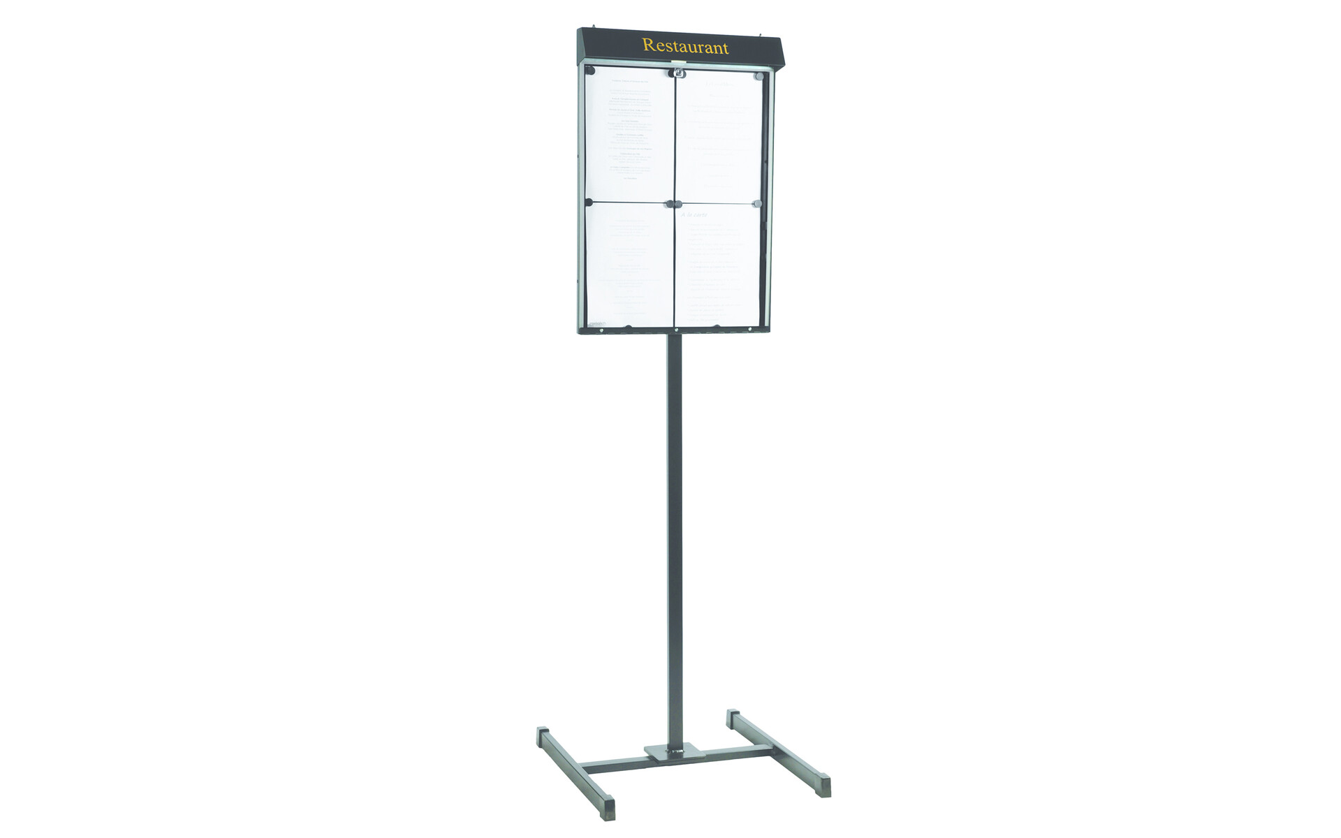 Surface d’affichage (longueur x hauteur en mm) : 460 x 600. Dimensions extérieures (longueur x profondeur x hauteur en mm) : 400 x 400 x 1850. Usage extérieur et intérieur. Une gravure par laser du nom de votre établissement est possible.