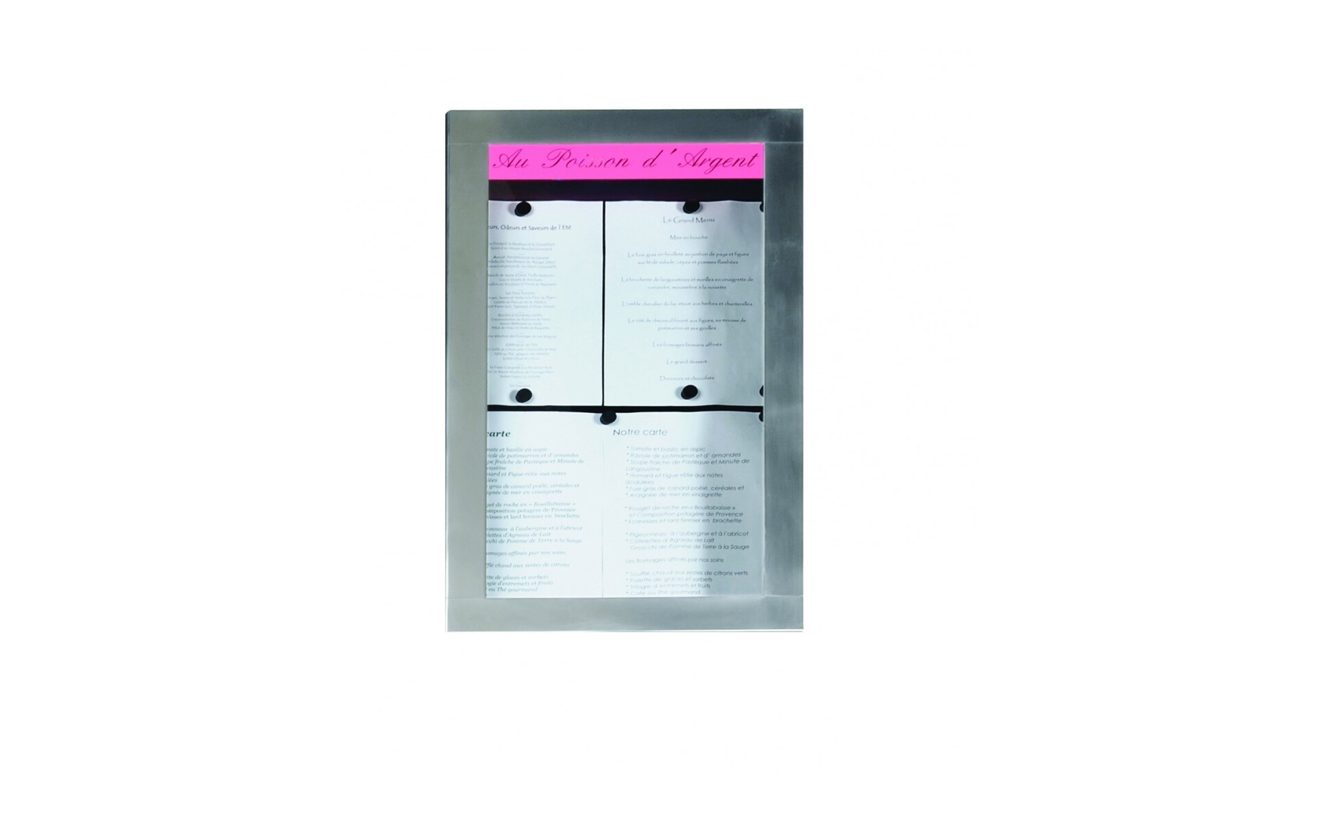 Surface d’affichage (longueur x hauteur en mm) : 400 x 650 Usage extérieur et intérieur. Une gravure par laser du nom de votre établissement est possible.