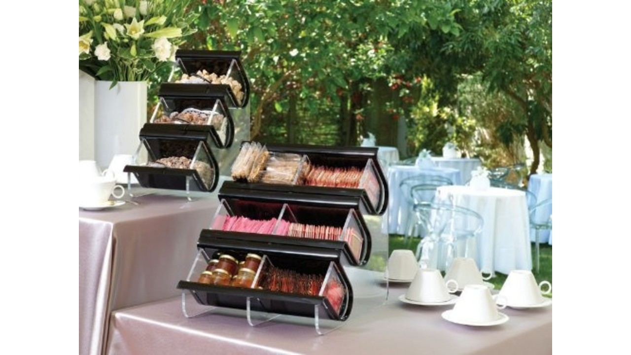 Parfait pour le sucre emballé, le sel, le poivre, les crémiers et même les produits de boulangerie. Utilisez-le dans les buffets, séminaires, boulangeries ou stations de café. Construction acrylique durable.