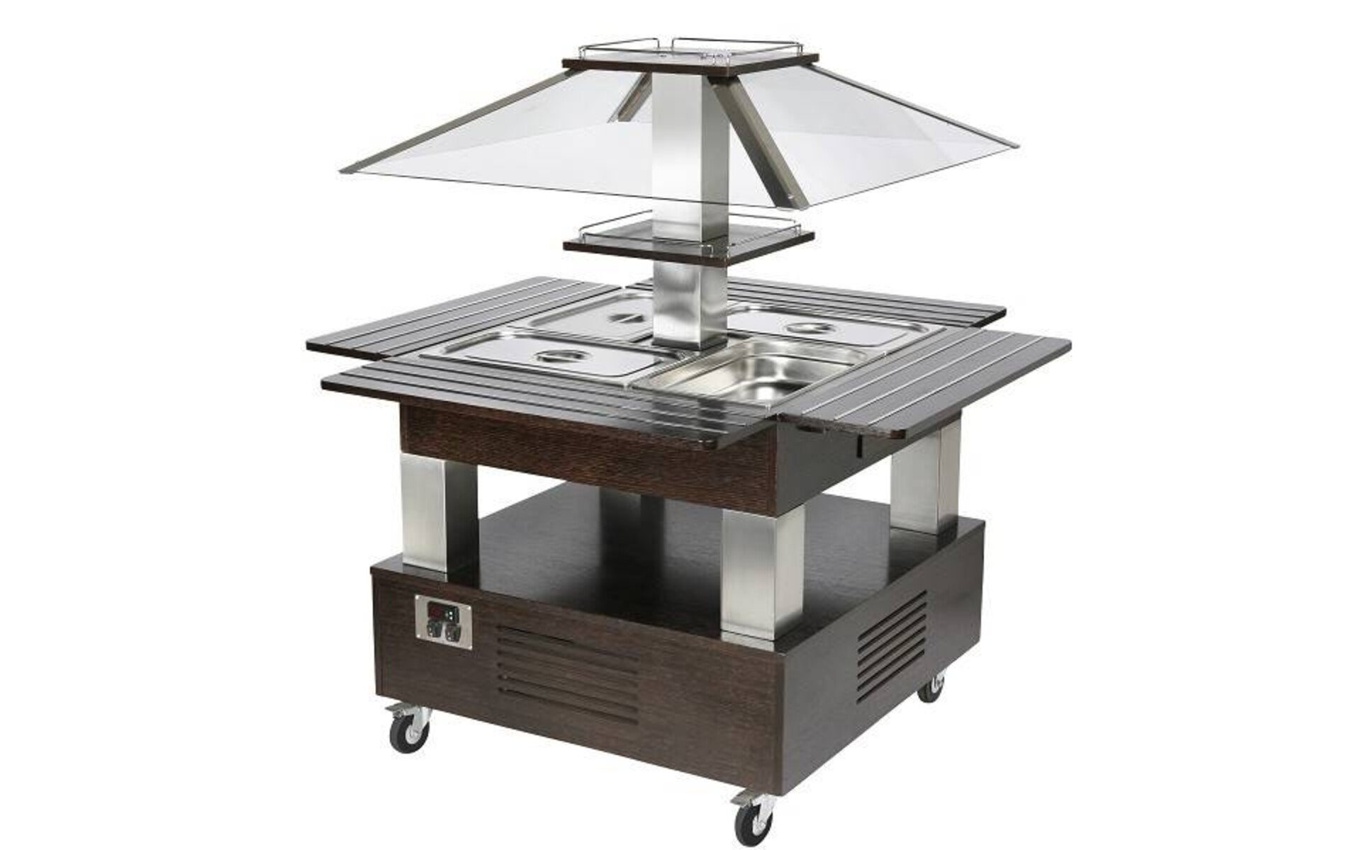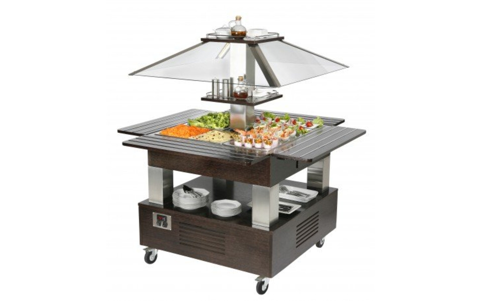 Salad-bar (+2/+10°C),froid de conduction via une épingle en contact avec la cuve. Gaz 134a, sans CFC, compresseur UH ou Danfoss. Capacité 4 x GN1/1-150 mm.