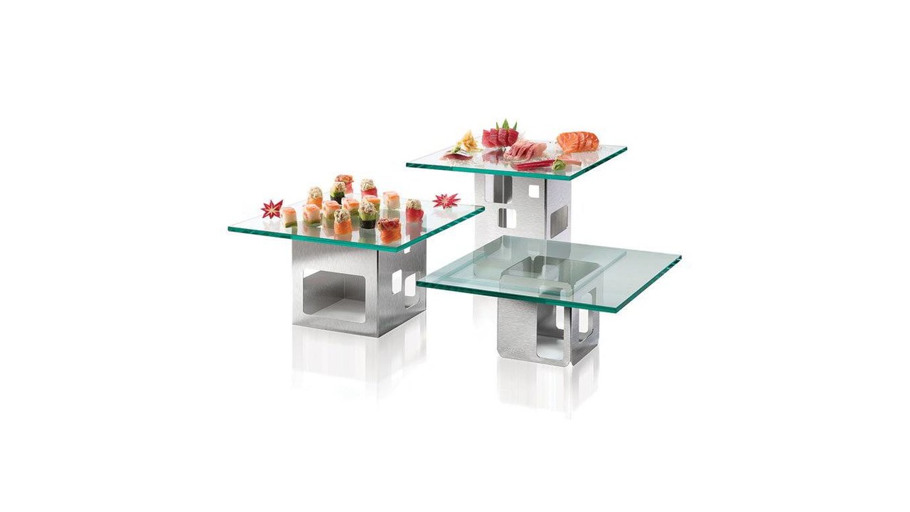3 supports en inoxydable avec 3 plats carrés en verre trempés. Dimensions des plats : 14 x 14cm , 18 x 18 cm en 25,5 x 25,5 cm