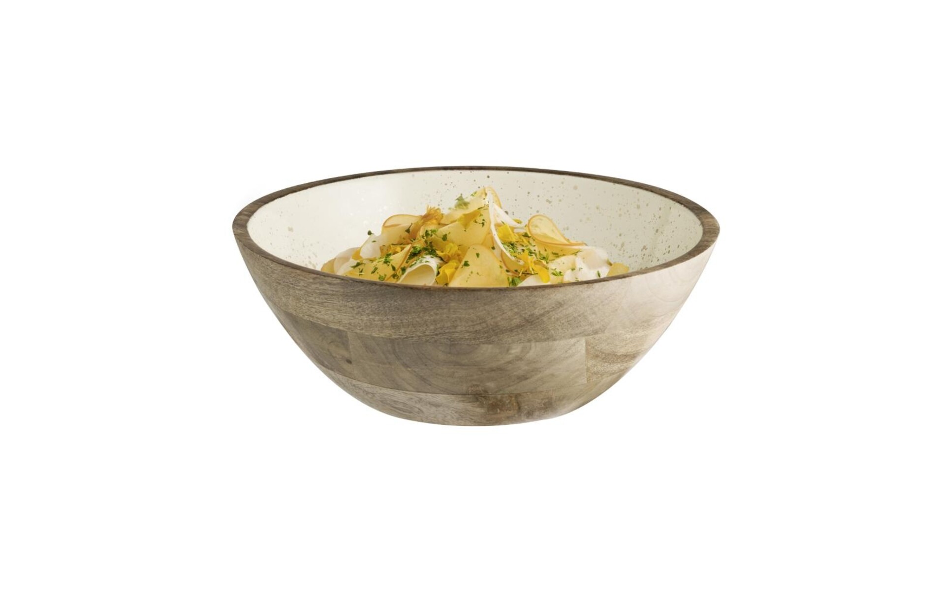 Chaque saladier est unique. Son intérieur en résine époxy est beige, brun et doré. Idéal pour des buffets raffinés et élégants, chaud ou froid, jusqu'à 40 °C. En raison de sa structure en bois, lavage à la main uniquement. Ne convient pas au lave-vaisselle.