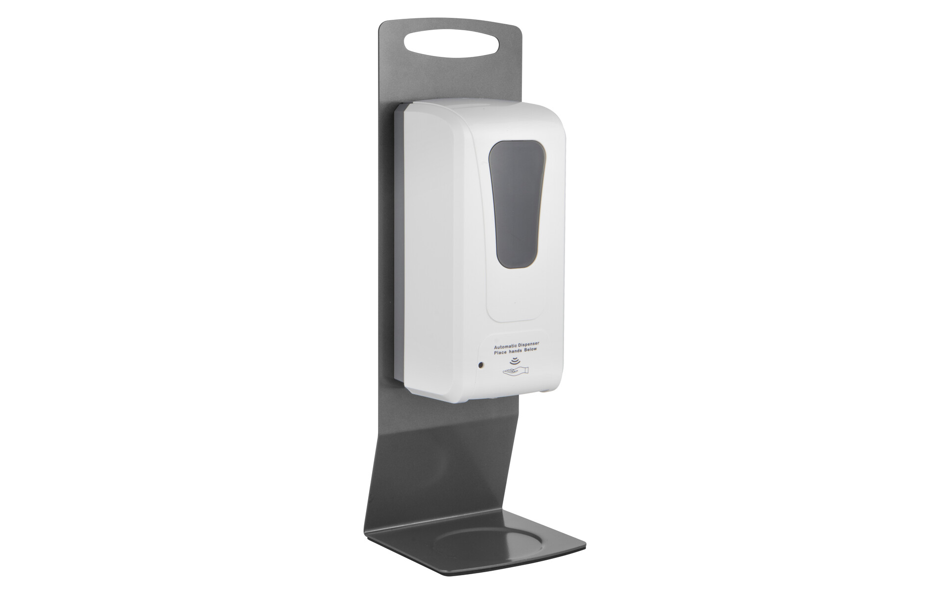 Le contenu du distributeur en plastique blanc est de 1 litre et est facilement rechargeable. La station de désinfection fonctionne avec 4 piles AA incluses. Dim. 15 x 15 x h 43,5 cm