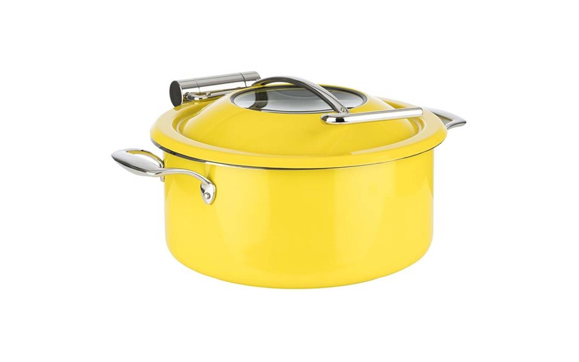 Une casserole bain marie jaune 4 litres avec couvercle avec système frein inclus.