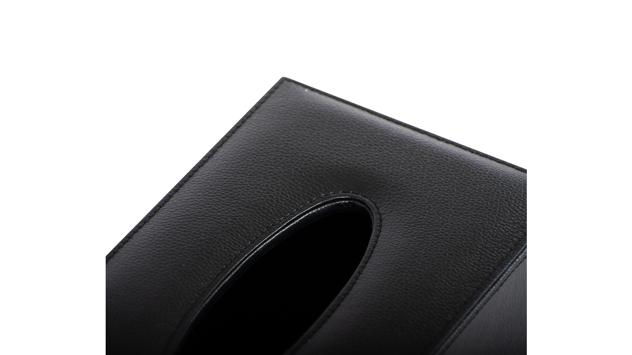 Aspect cuir véritable avec coutures noires. Hydrofuge. Facile à nettoyer. Compatible avec les boites mouchoires courantes. Avec couvercle avec fermeture magnétique. Dim. 25 x 13,5 x h 8,5 cm.