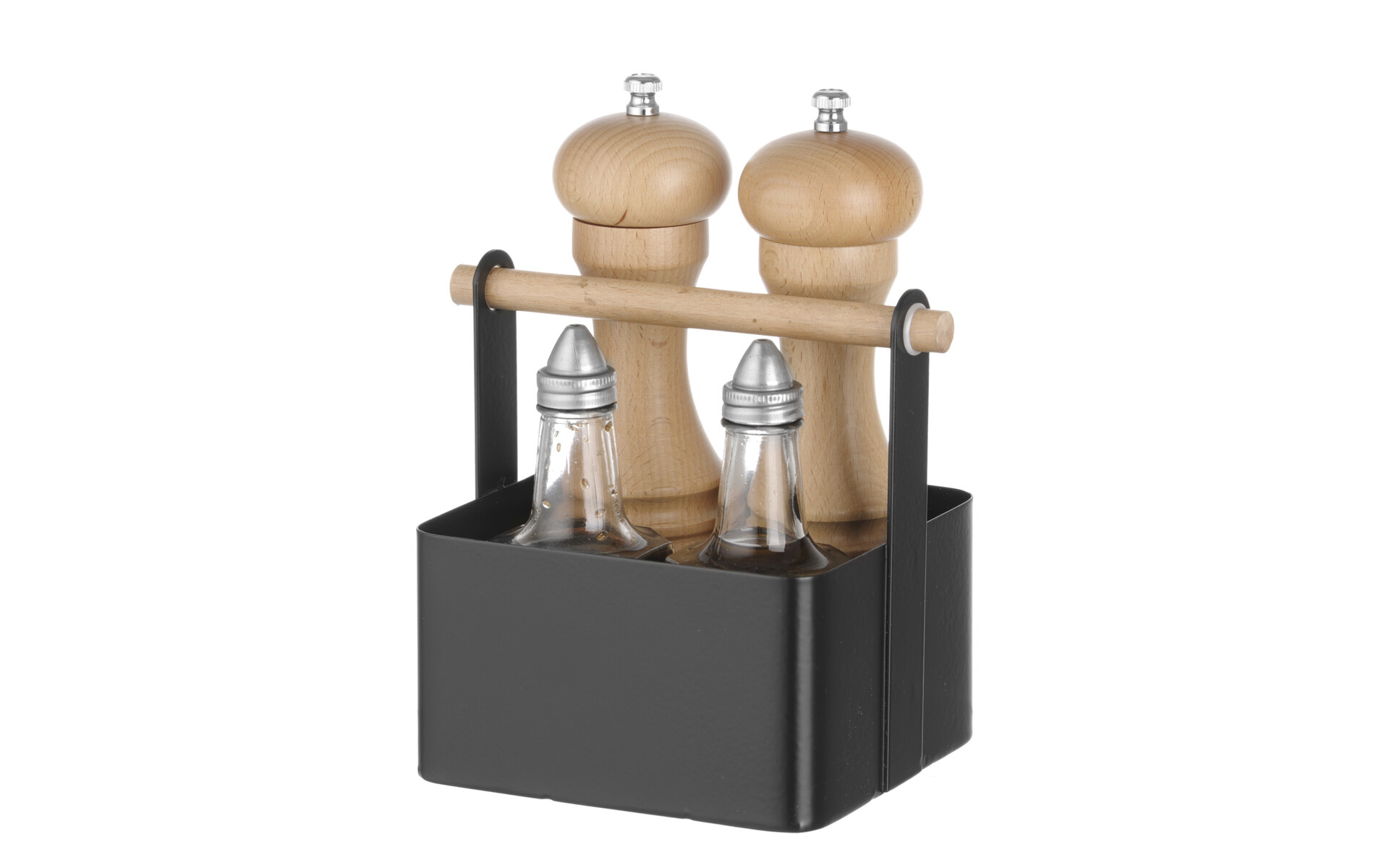 Avec une poignée en bois. Finition avec une couche de peinture de poudre noir mat. Dim. 170 x 130 x h 160 mm Fournie vide , moulin à poivre et sel NON compris à commander séparément