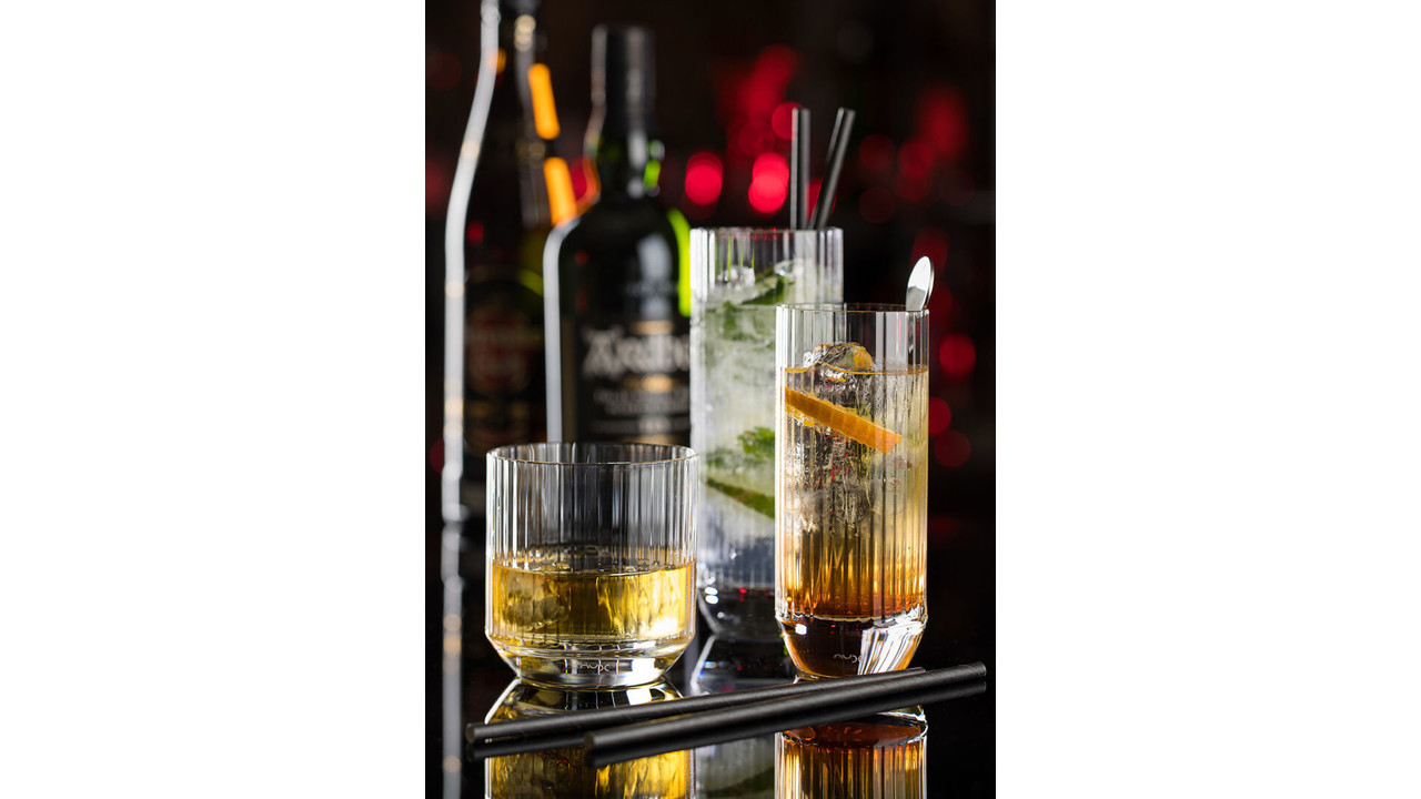 Une collection accrocheuse avec des nervures verticales serrées qui non seulement captent la lumière mais apportent de la texture au service. Le pied effilé ajoute de la légèreté à cette verrerie sophistiquée et époustouflante.