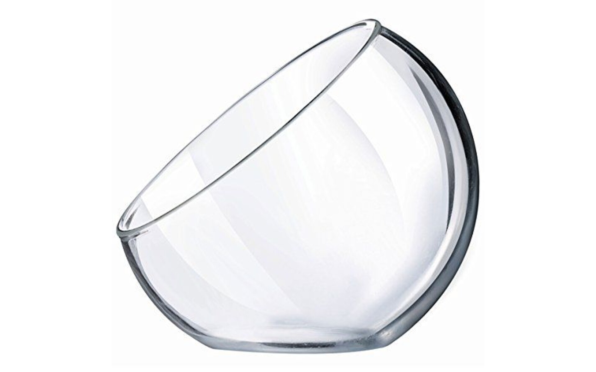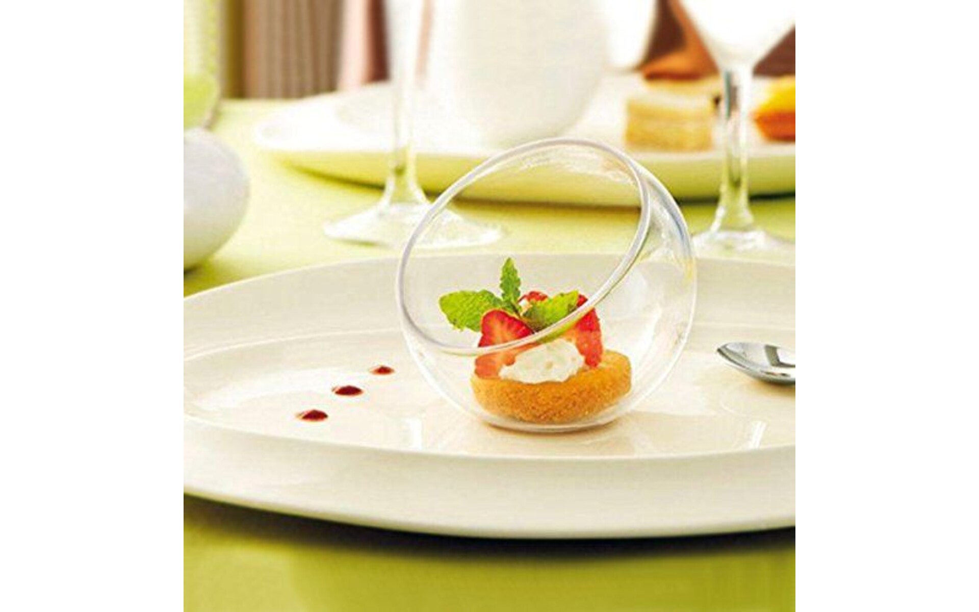 Mini half-bubble shaped dessert dish • Material: Annealed glass • Unique slanted design • Perfect for presenting tasters at dinner parties • Suitable for serving entrees, appetisers or desserts