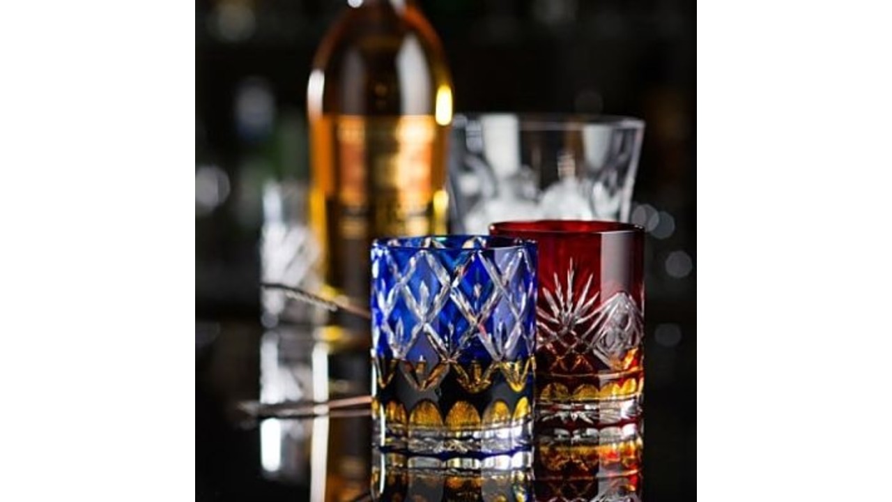 Luxe water of whiskyglas te combineren met wijnglazen op voet.