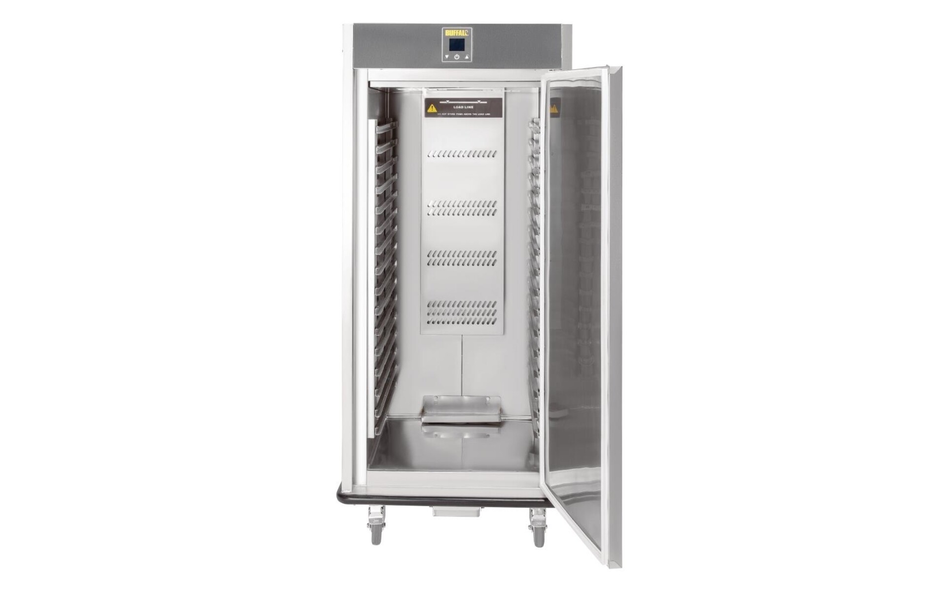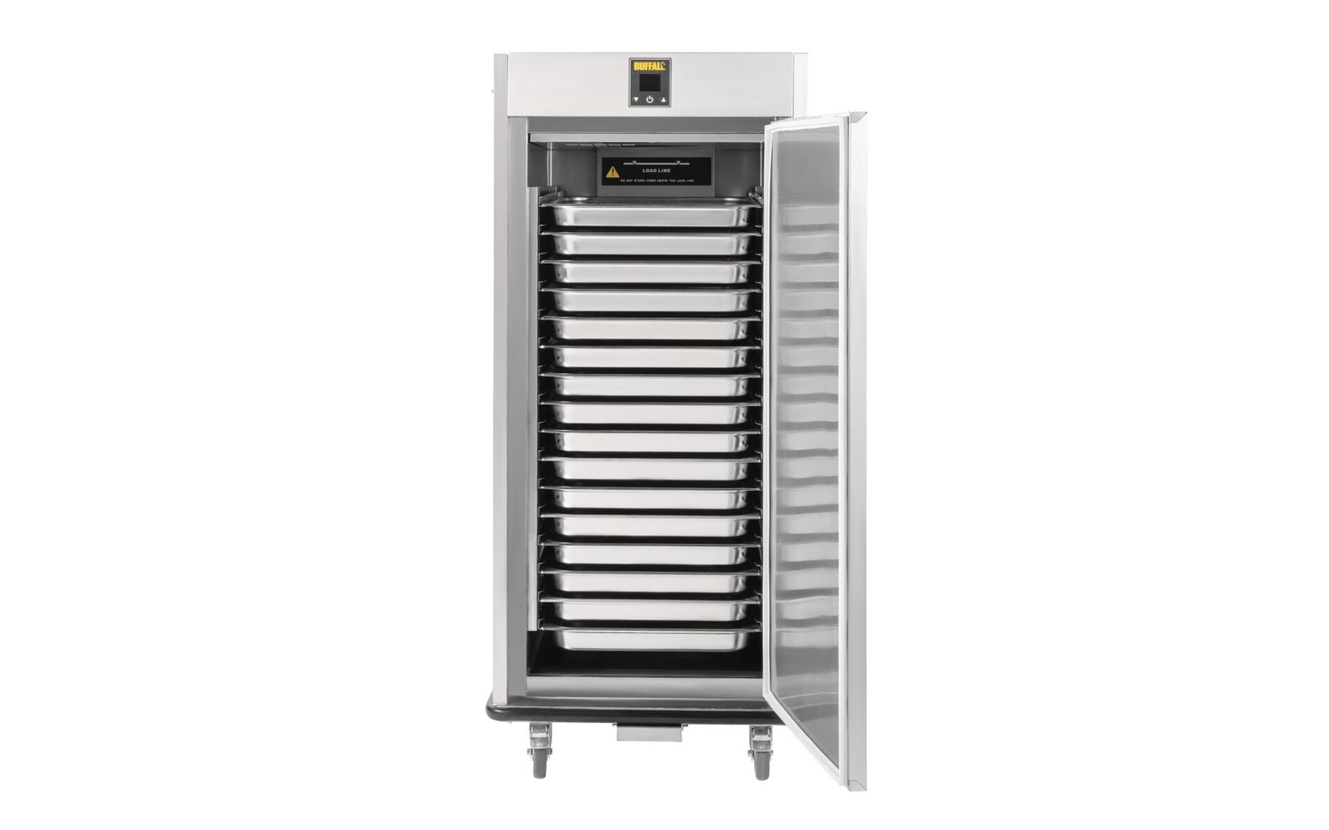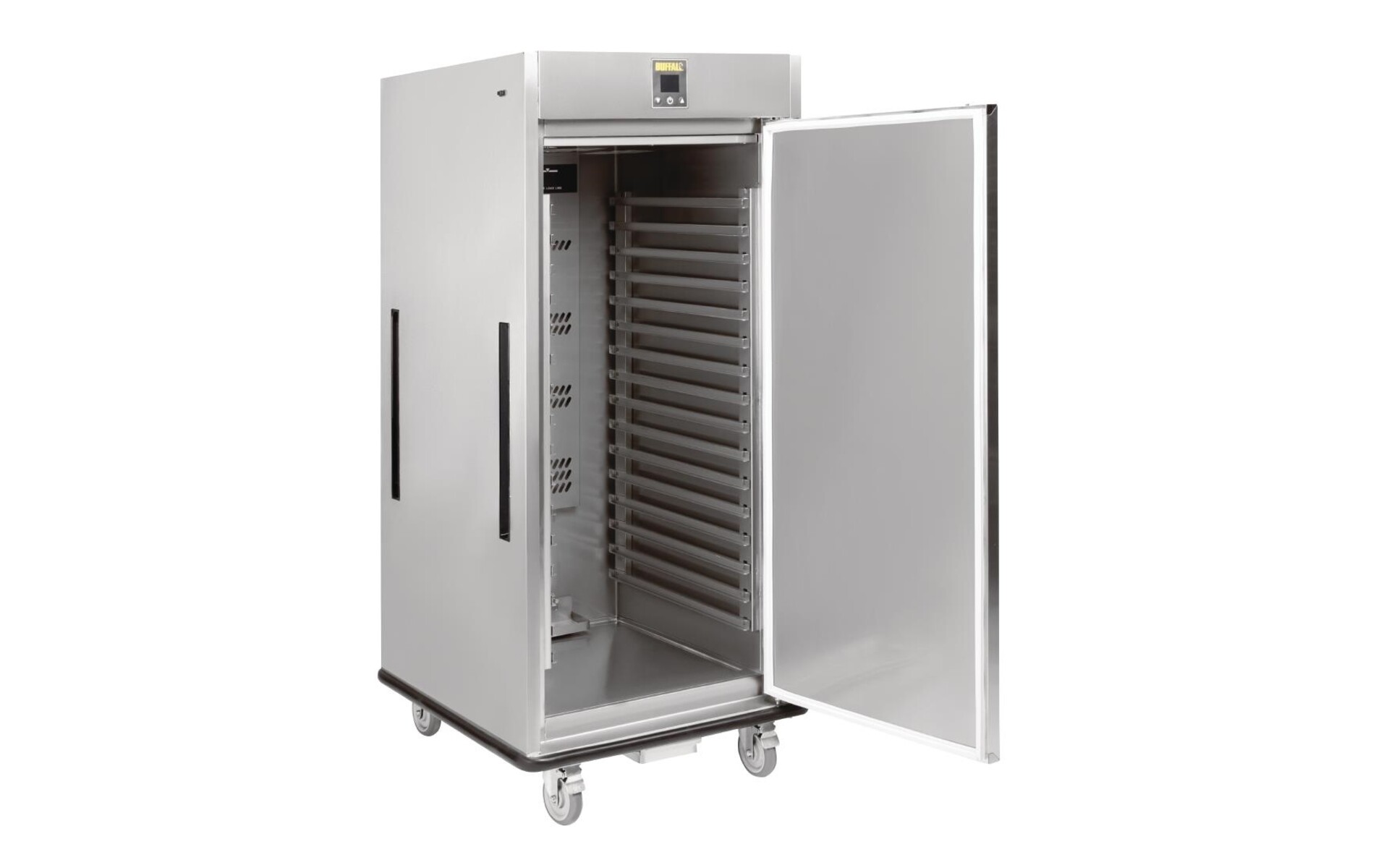 Deze verwarmde banketwagen van Buffalo is een ideaal apparaat om warme gerechten lang warm te houden. Er passen 16 gastronorm bakken in (GN 2/1) in, waardoor het apparaat meer dan genoeg capaciteit biedt voor grote banketten en evenementen. Anderzijds kunnen er ook ondiepe GN bakken met opgemaakte borden ingeschoven worden. Dankzij de stevige wielen en handgrepen is de wagen eenvoudig te manoeuvreren en de geavanceerde isolatie zorgt voor een efficiënte werking. Ook is de banketwagen eenvoudig te reinigen dankzij de ronde hoeken en de RVS constructie.